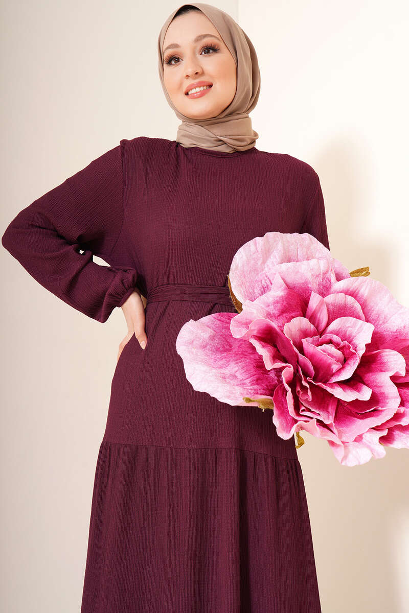Kat Kat Bürümcük Kuşaklı Elbise Mürdüm