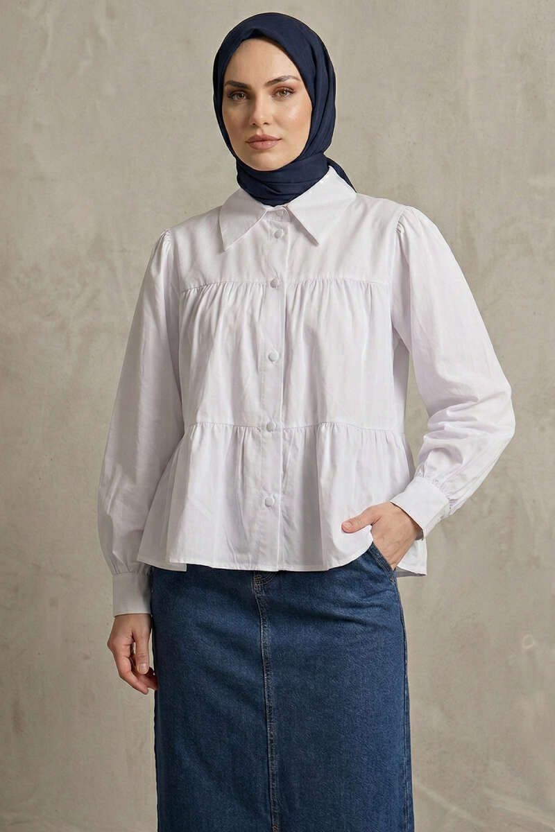 Kat Kat Detaylı Büzgülü Gömlek Beyaz