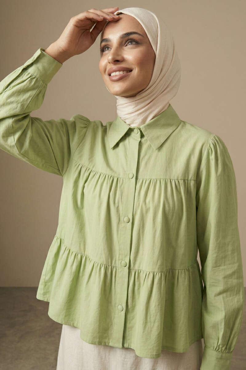 Kat Kat Detaylı Büzgülü Gömlek Çağla Yeşili
