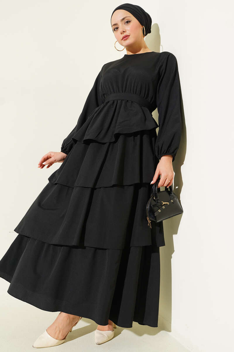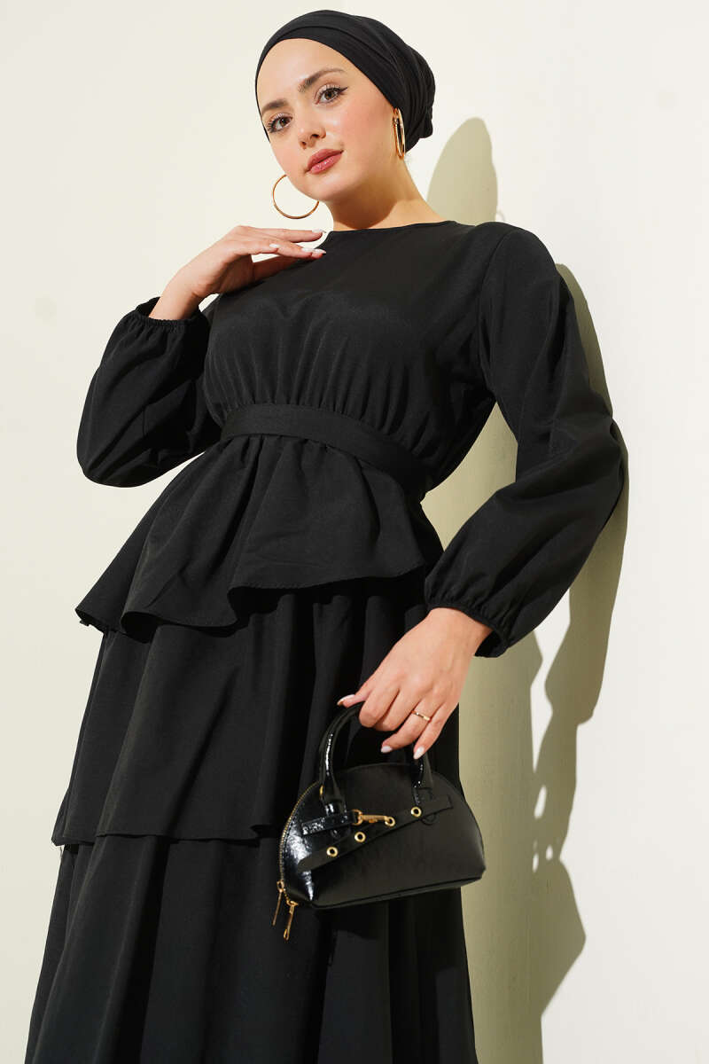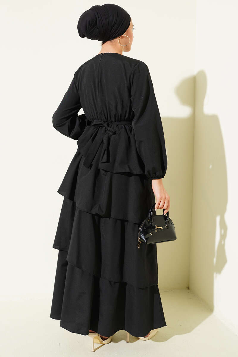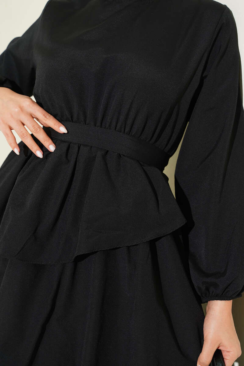 Bel Büzgülü Bağlamalı Elbise Siyah