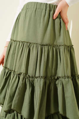 Kemer Aksesuarlı Ekoseli Etek Haki
