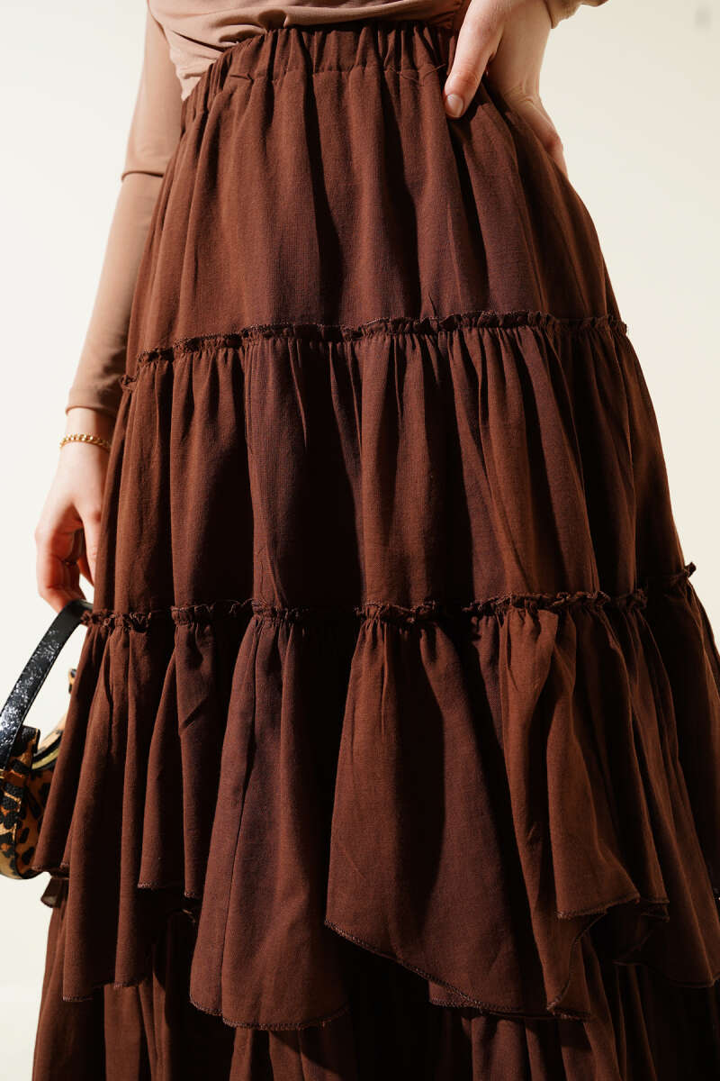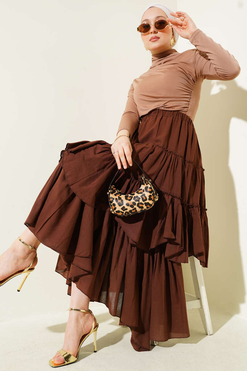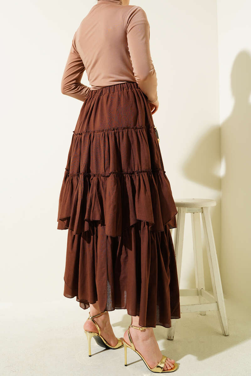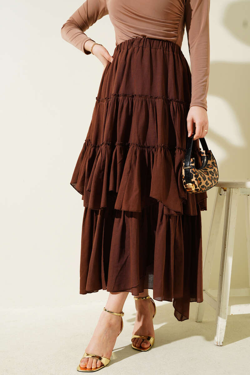 Yan Kemer Detaylı Ekoseli Etek Kahve