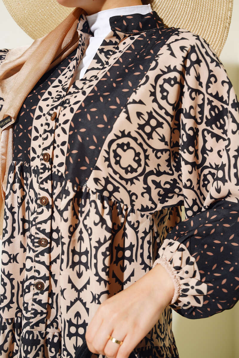 Metal Düğme Süslemeli Bağcıklı Elbise Vizon