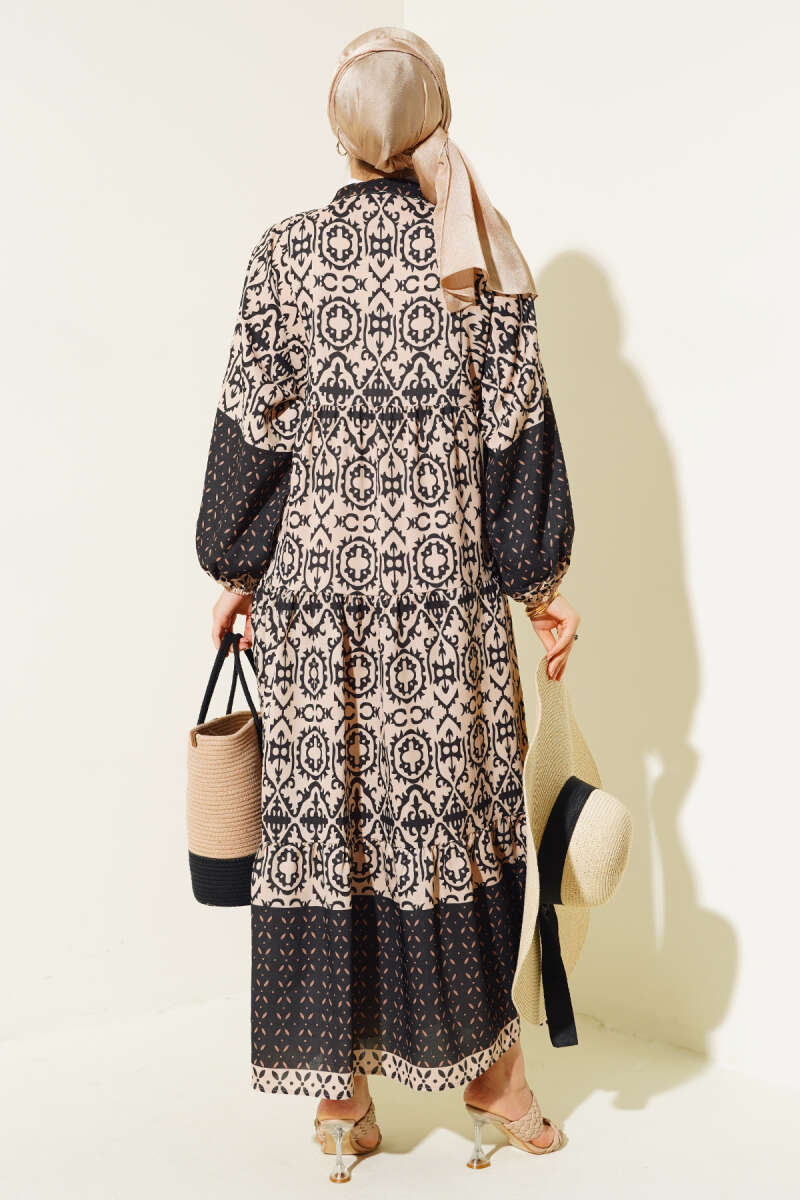 Metal Düğme Süslemeli Bağcıklı Elbise Siyah