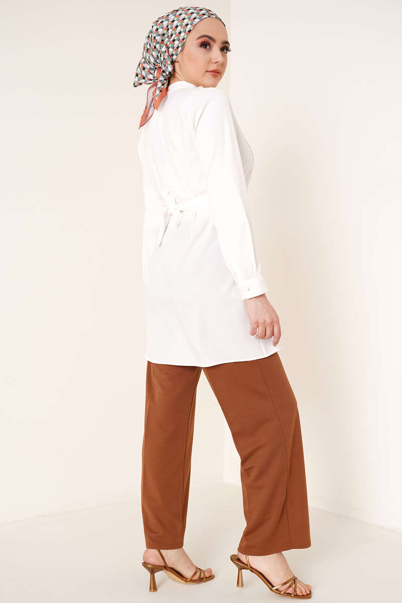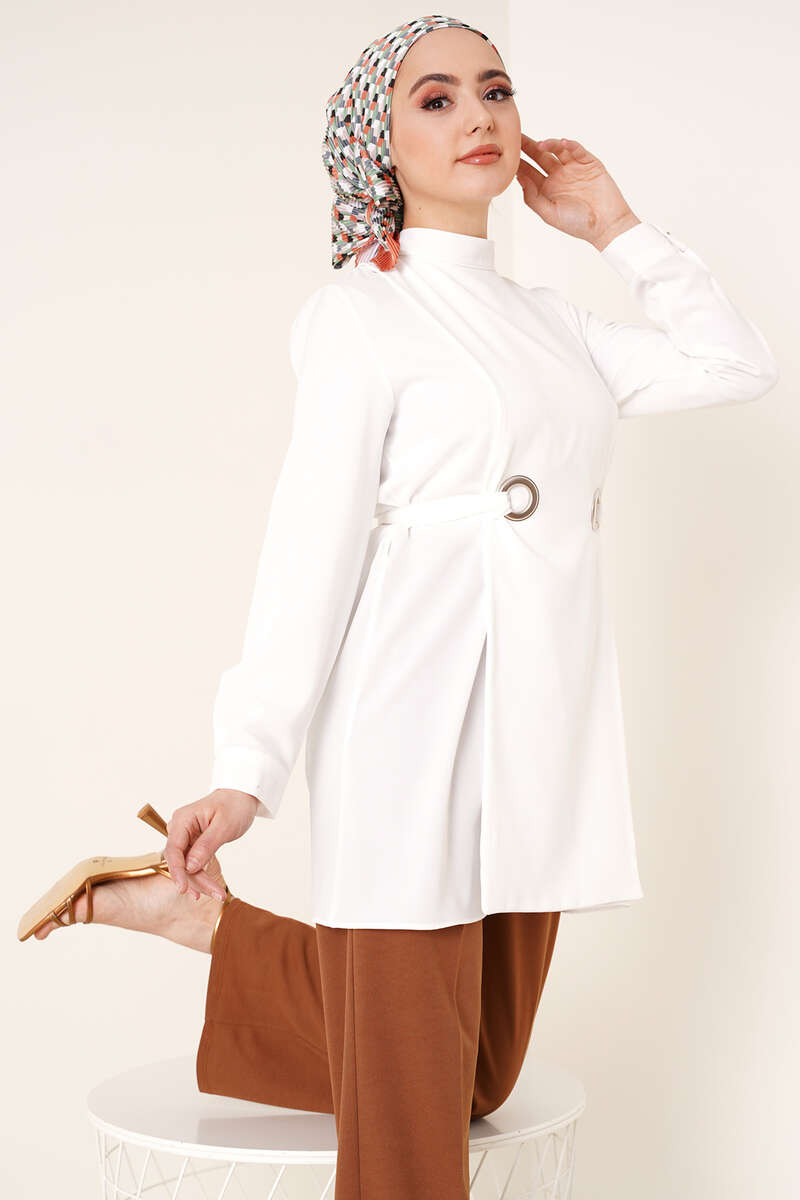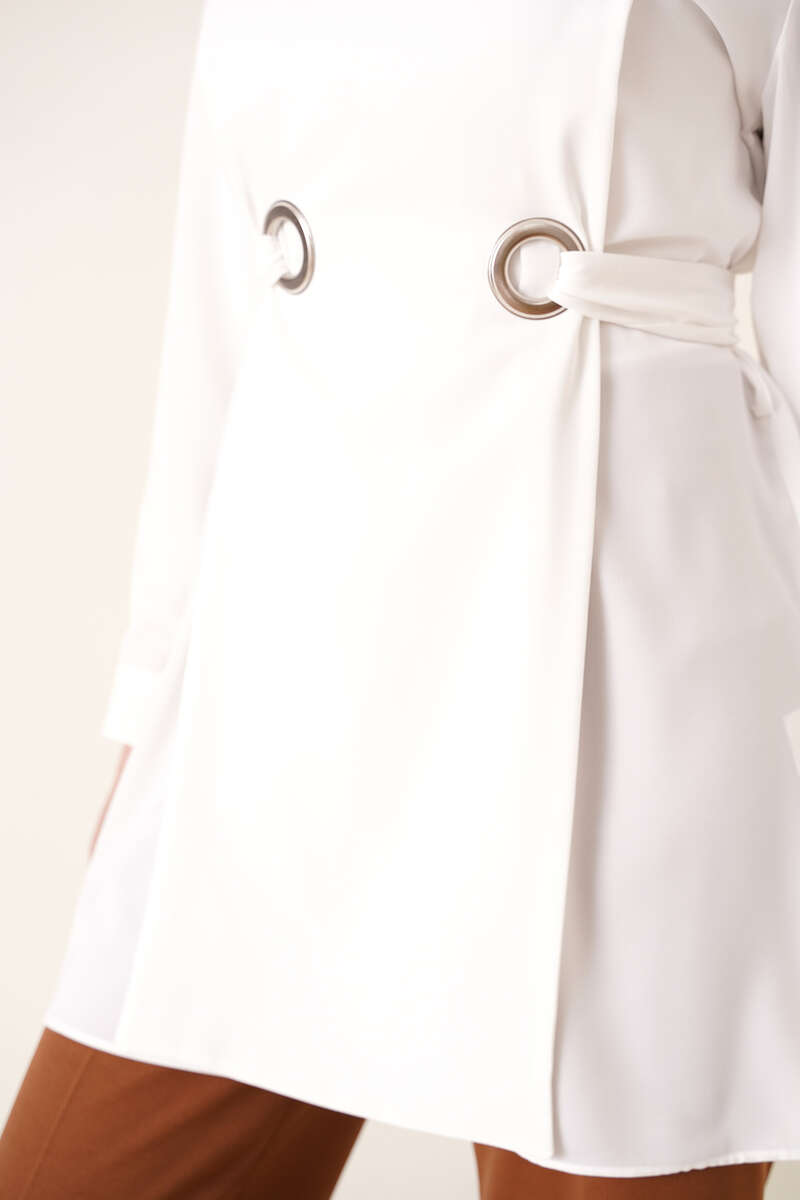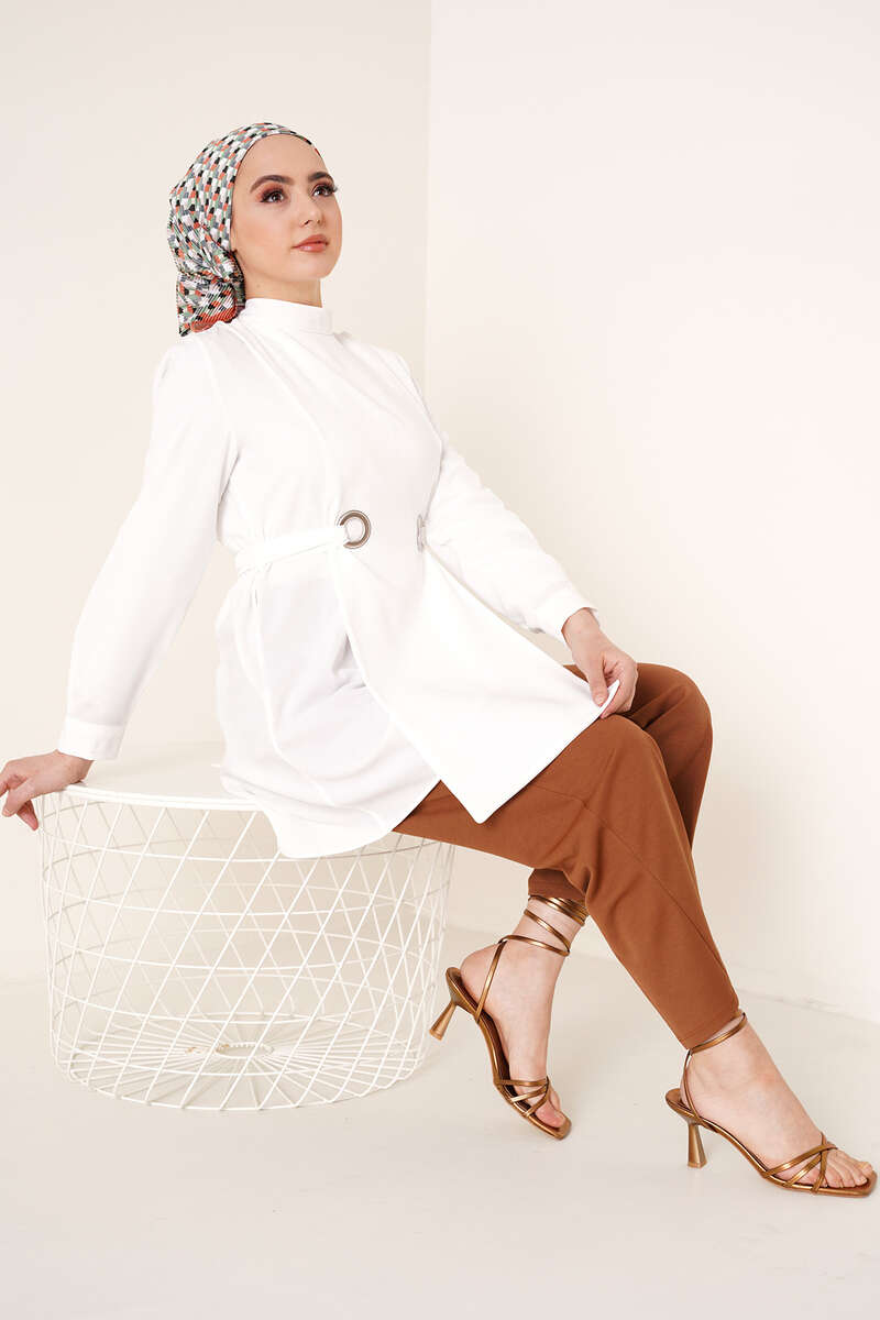 Yeni sezon tuniğimiz önünde yakasından gelen kuşgözlü katıyla dikkat çekmektedir. Beli kuşaklı olan tuniğimizin iki adet kemer köprüsü bulunmaktadır. Ense düğmesi bulunan tuniğimiz hakim yakadır.