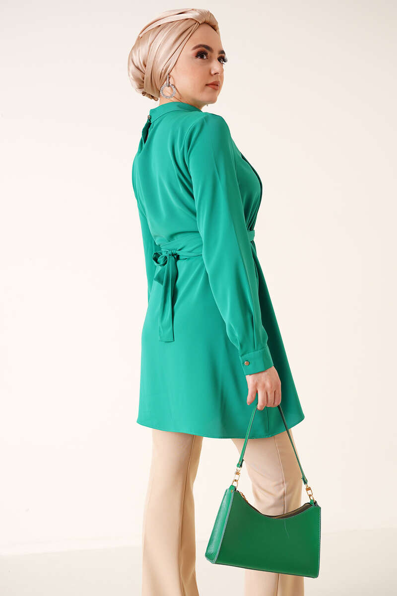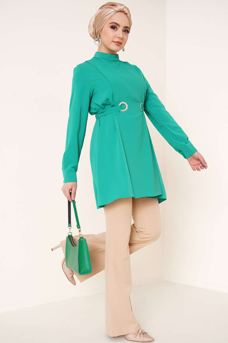 Yeni sezon tuniğimiz önünde yakasından gelen kuşgözlü katıyla dikkat çekmektedir. Beli kuşaklı olan tuniğimizin iki adet kemer köprüsü bulunmaktadır. Ense düğmesi bulunan tuniğimiz hakim yakadır.