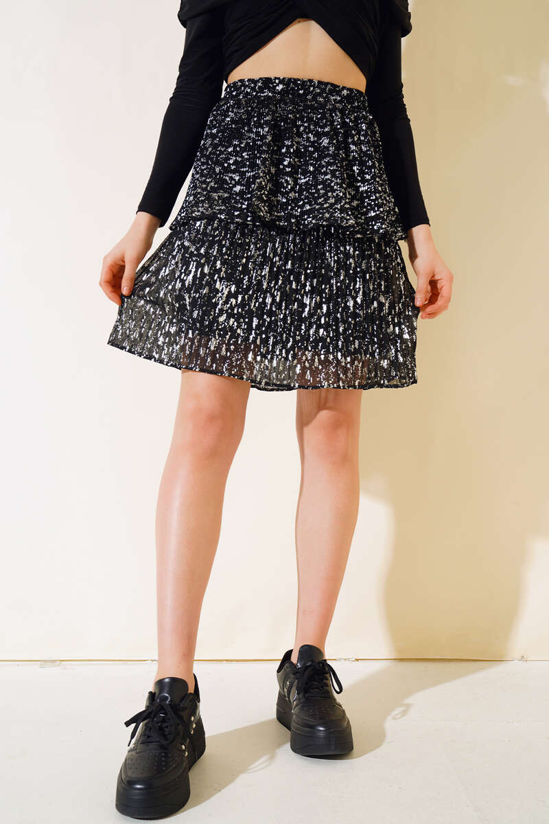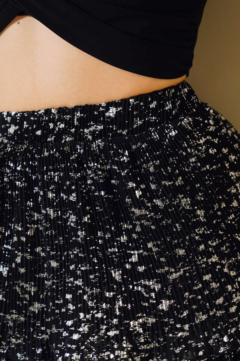 Katlı Piliseli Mini Etek Siyah