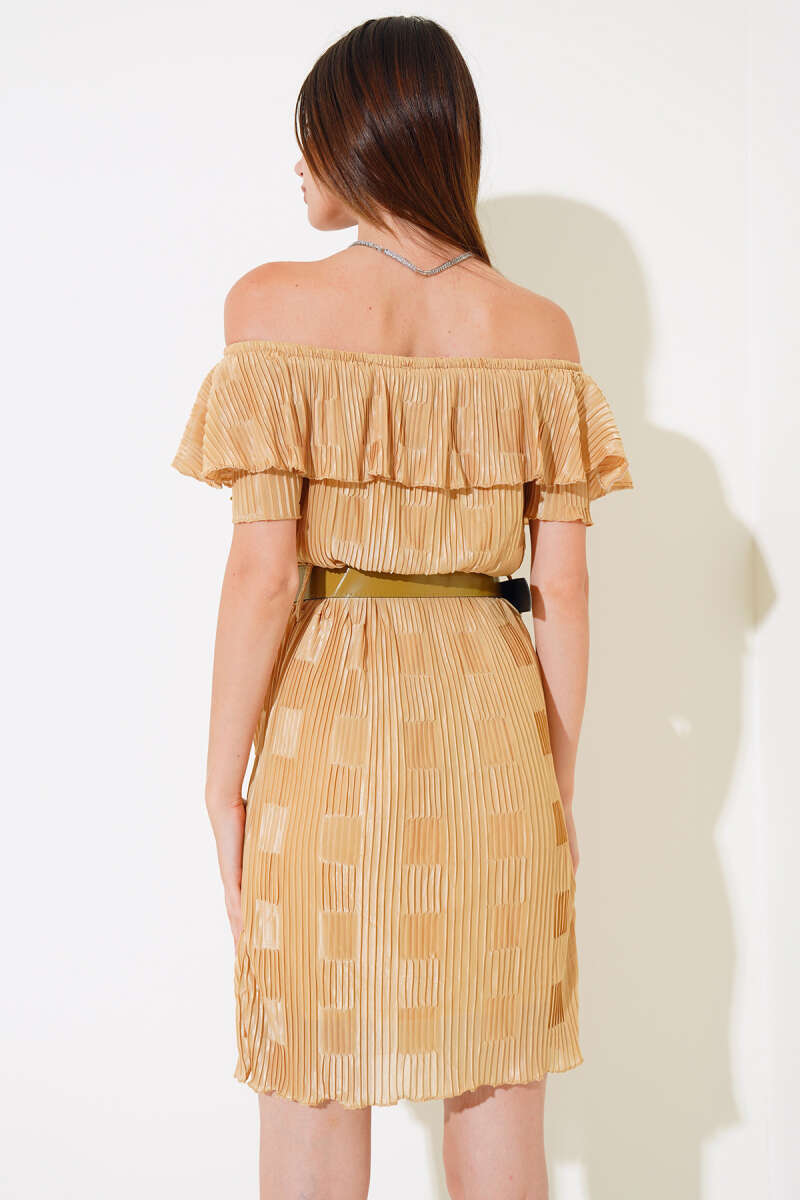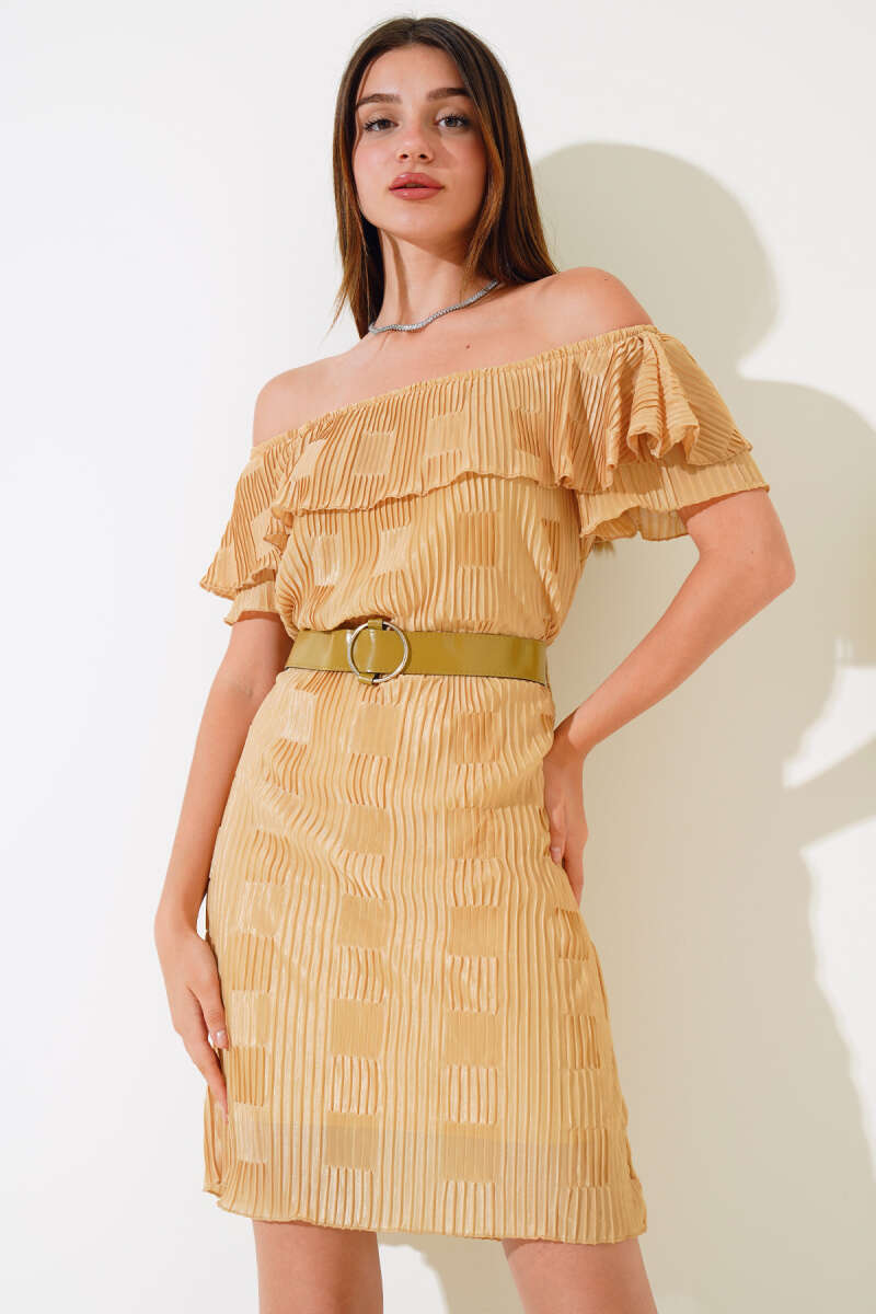 Kayık Yaka Piliseli Elbise Yağ Yeşili