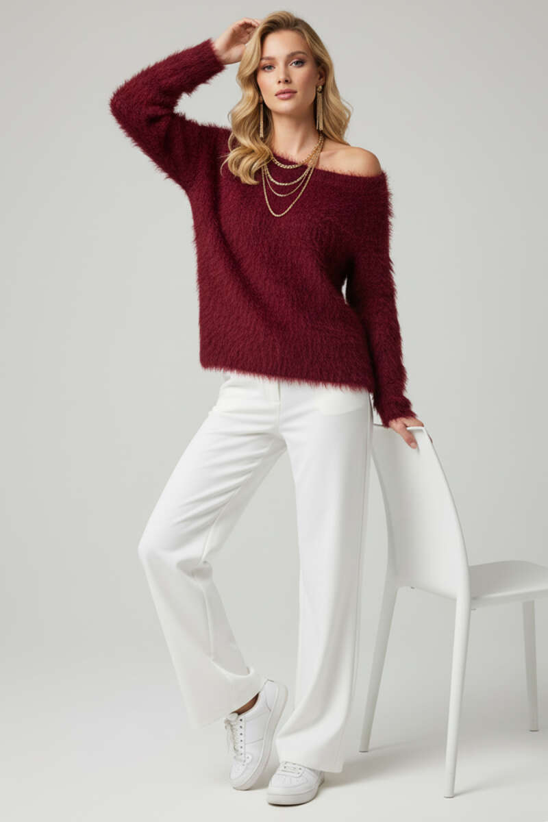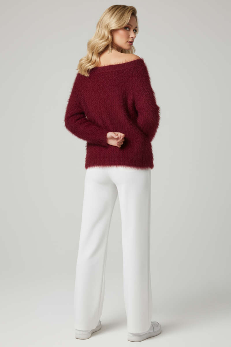 Kayık Yaka Tüylü Kazak Bordo