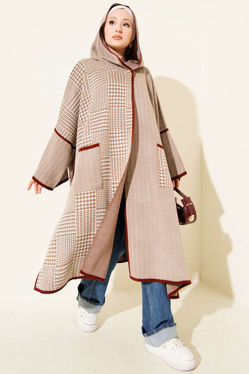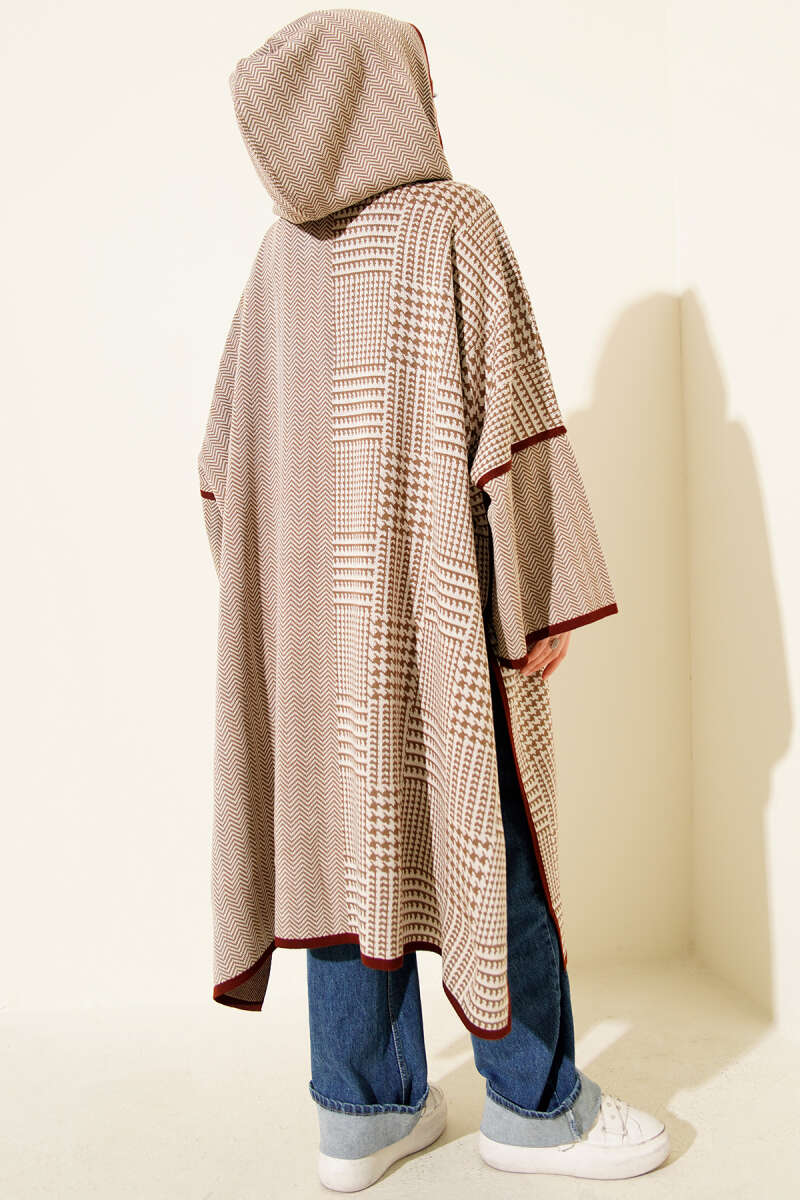 Kabartma Desen Püsküllü Kapüşonlu Panço Füme