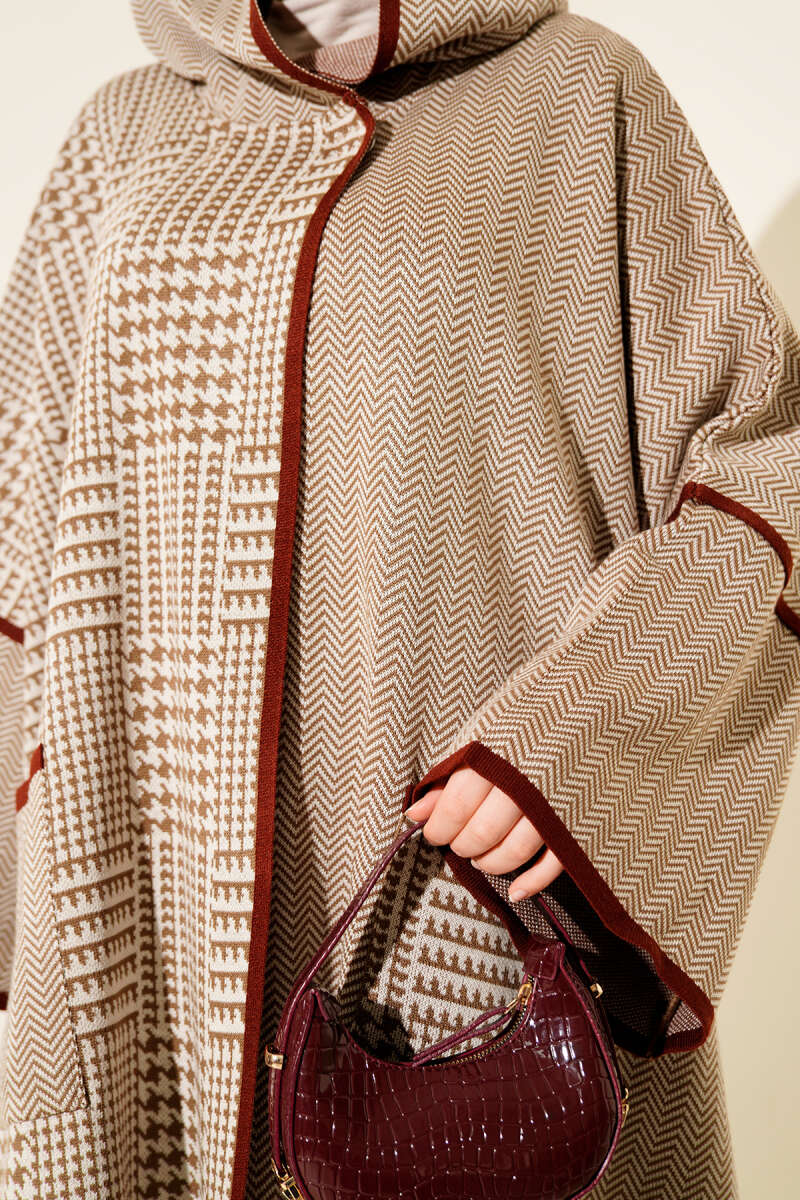 Çıtçıt Düğmeli Kapüşonlu Triko Panço Bej