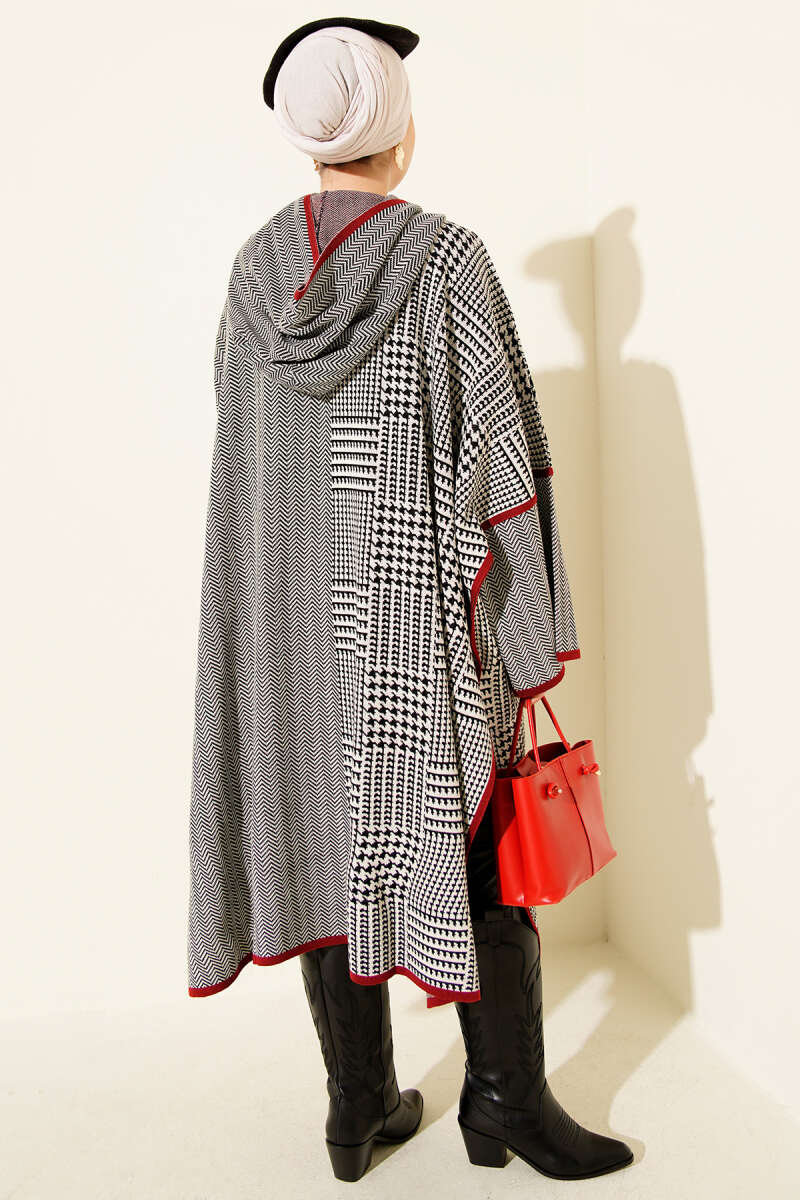 Düğmeli Kapüşonlu Granili Panço Siyah
