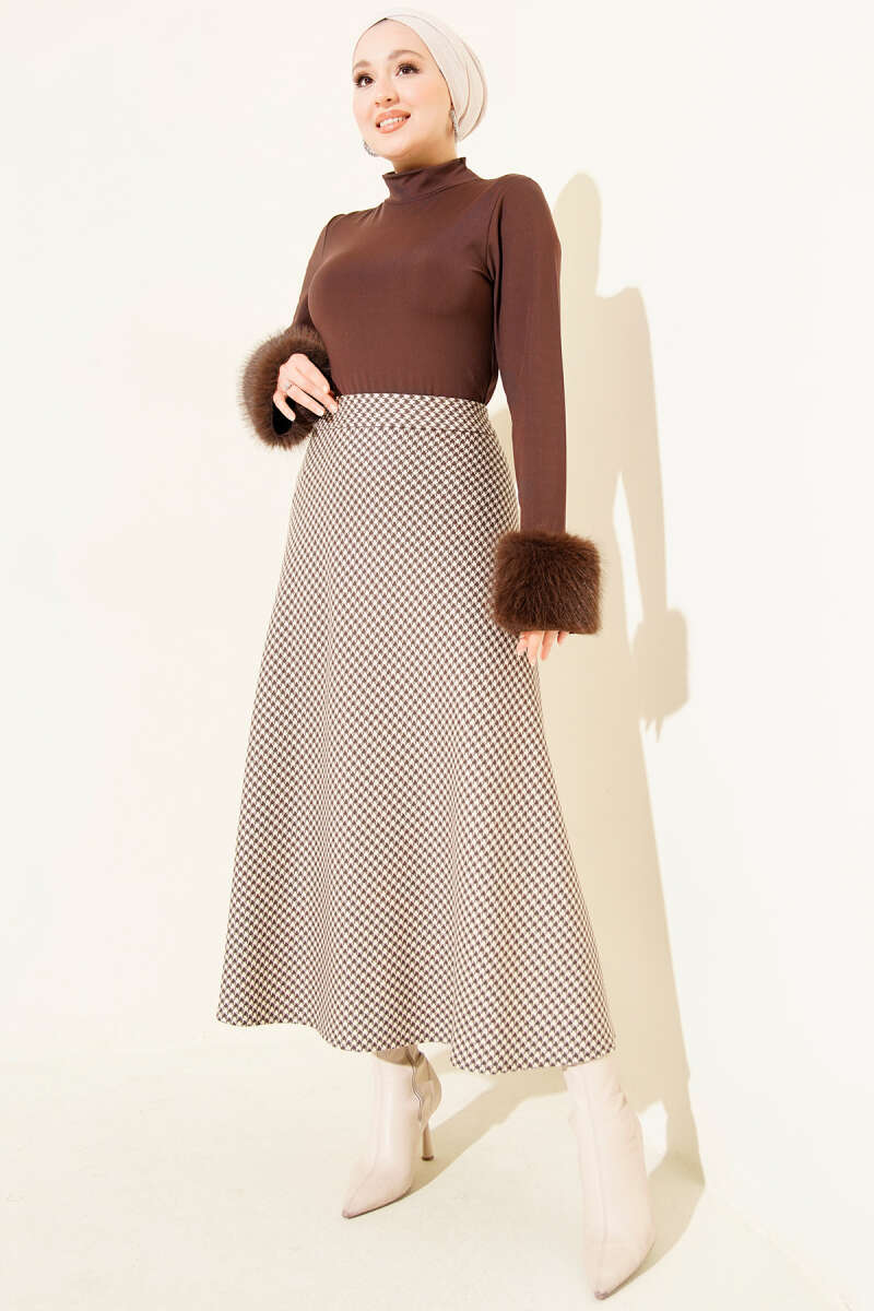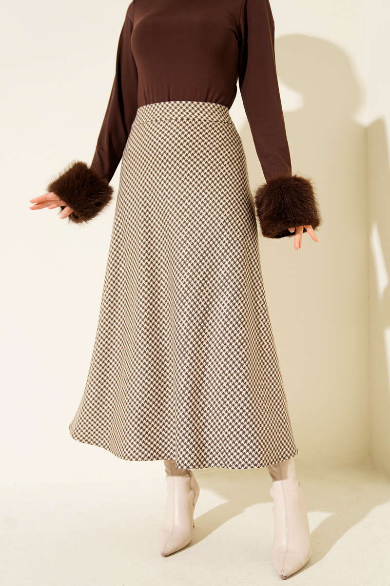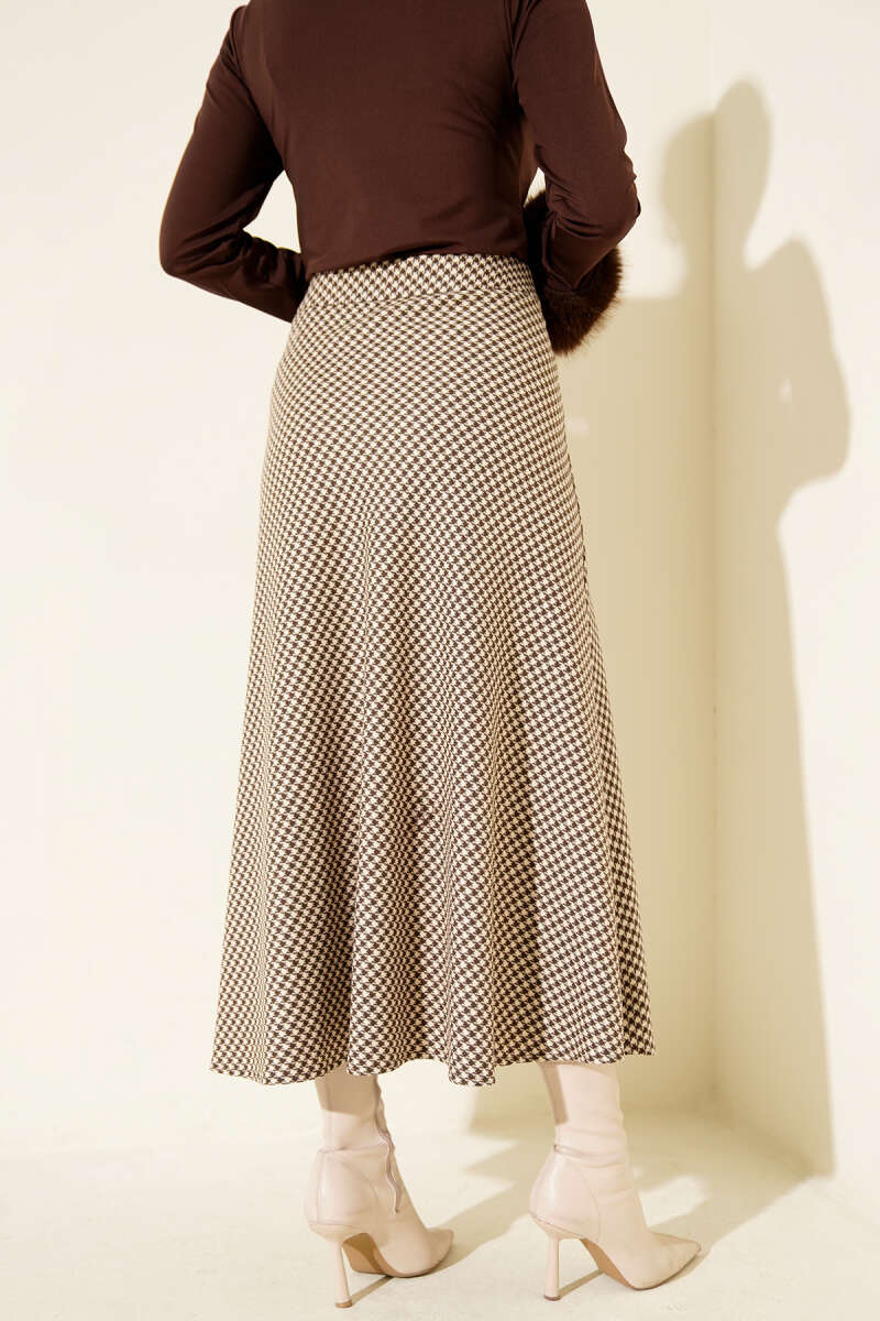 Ekose Desen Pileli Kloş Etek Kahve