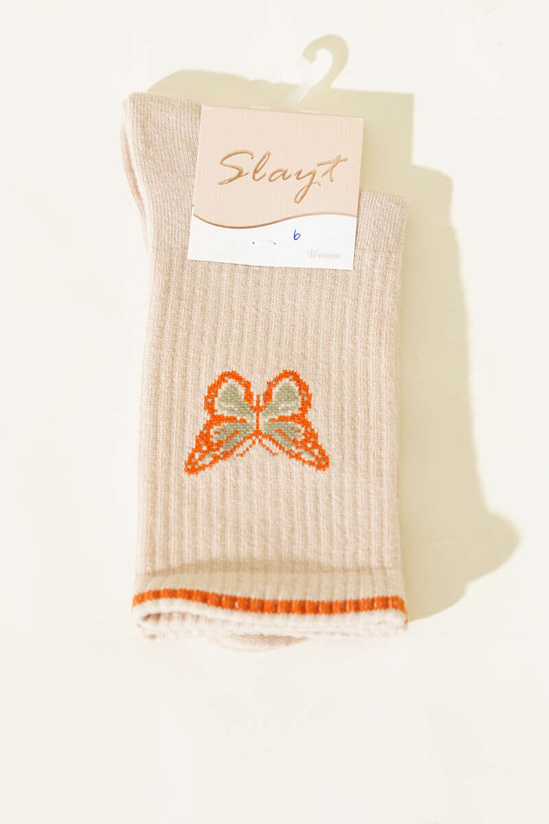 Kelebek Detaylı Kadın Soket Çorap Bej