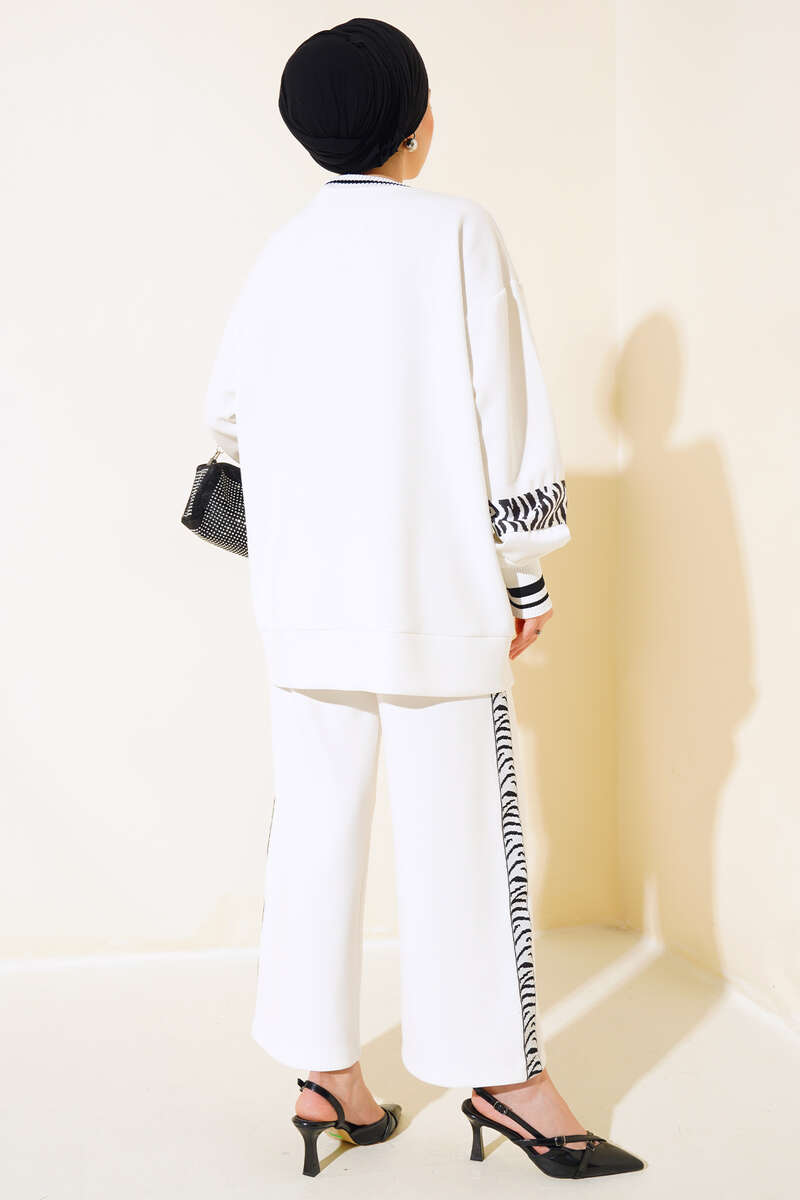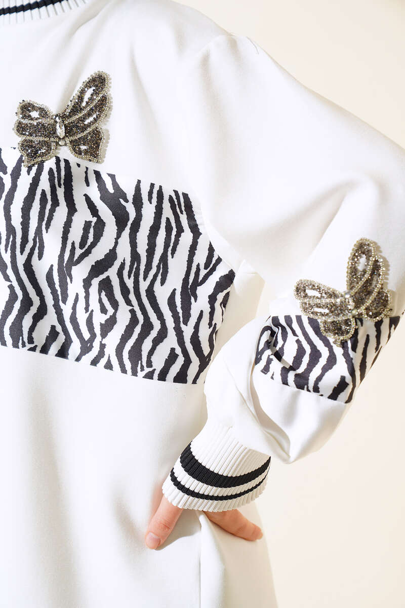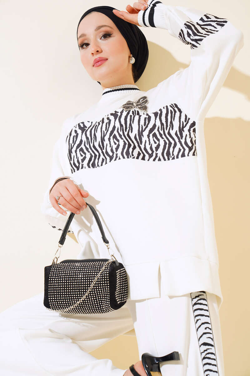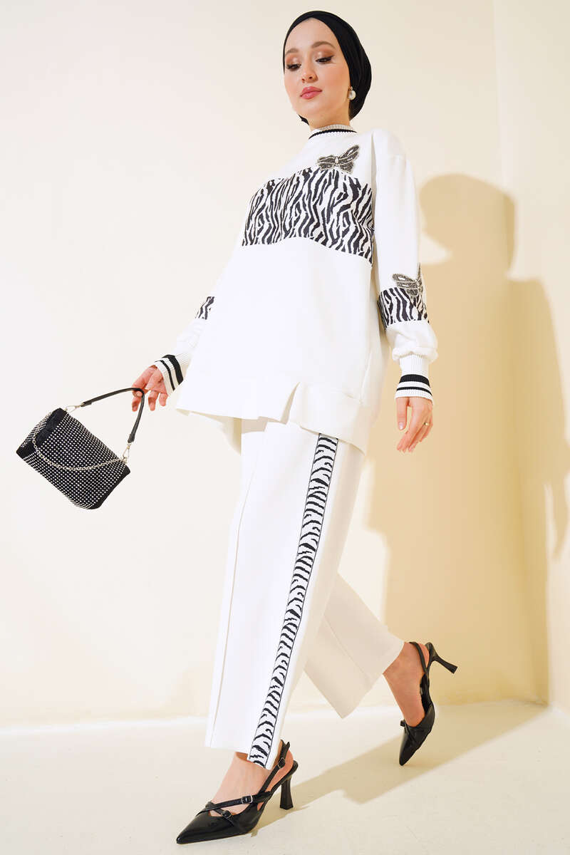 Yeni sezon ikili takım modelimiz sizlerle beraber. Tuniğimizin kol bilekleri ve yakası ribanalıdır. Taşlı kelebek deseni ile şık kazanmıştır. Etek ucu yandan yırtmaçlıdır. Kol ve önünde saten garnili şerit mevcuttur. Pantolonumuzun beli lastiklidir. Geniş paça modeldir. Yanları şerit detaylıdır. İkili takım modelimizin renk seçenekleri mevcuttur.