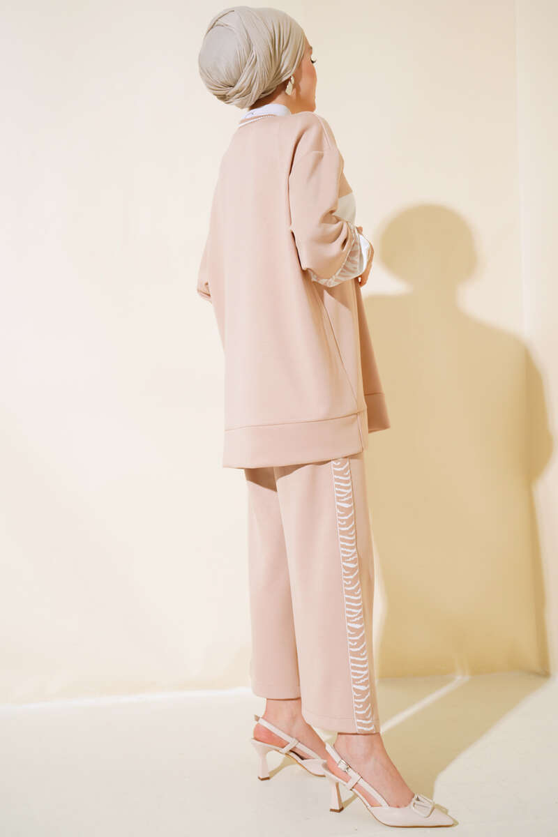 Yeni sezon ikili takım modelimiz sizlerle beraber. Tuniğimizin kol bilekleri ve yakası ribanalıdır. Taşlı kelebek deseni ile şık kazanmıştır. Etek ucu yandan yırtmaçlıdır. Kol ve önünde saten garnili şerit mevcuttur. Pantolonumuzun beli lastiklidir. Geniş paça modeldir. Yanları şerit detaylıdır. İkili takım modelimizin renk seçenekleri mevcuttur.