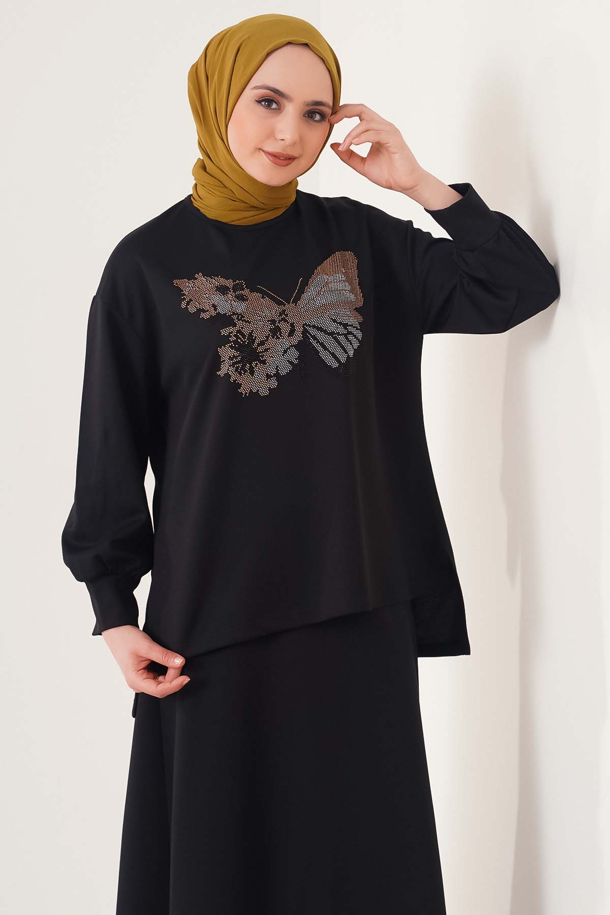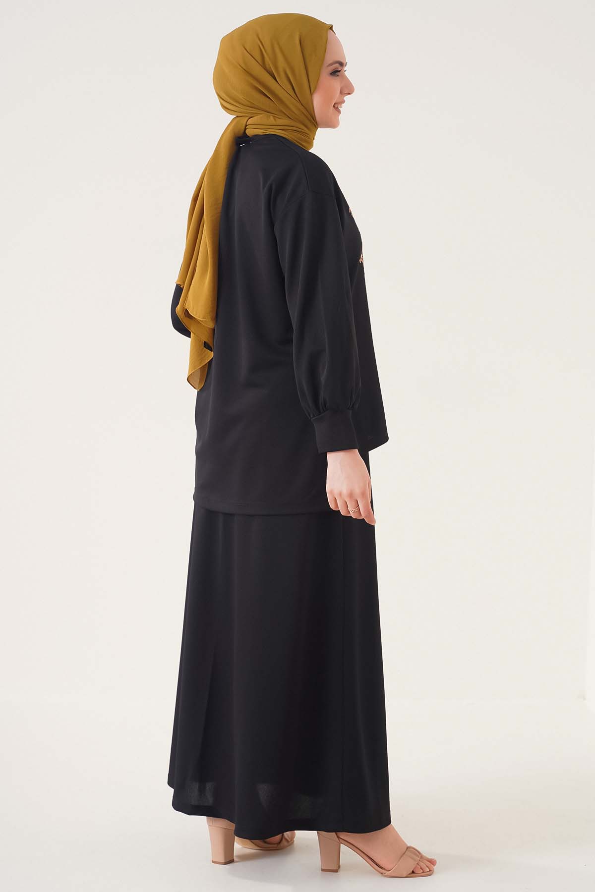 İkili takımımız yeni sezon modeldir. İkili takımın tuniği kelebek taş süslemelidir. Düşük omuz model olan tuniğimizin arkası önünden uzundur. Bisiklet yakadır. İkili takımımızın eteğinin beli lastiklidir.