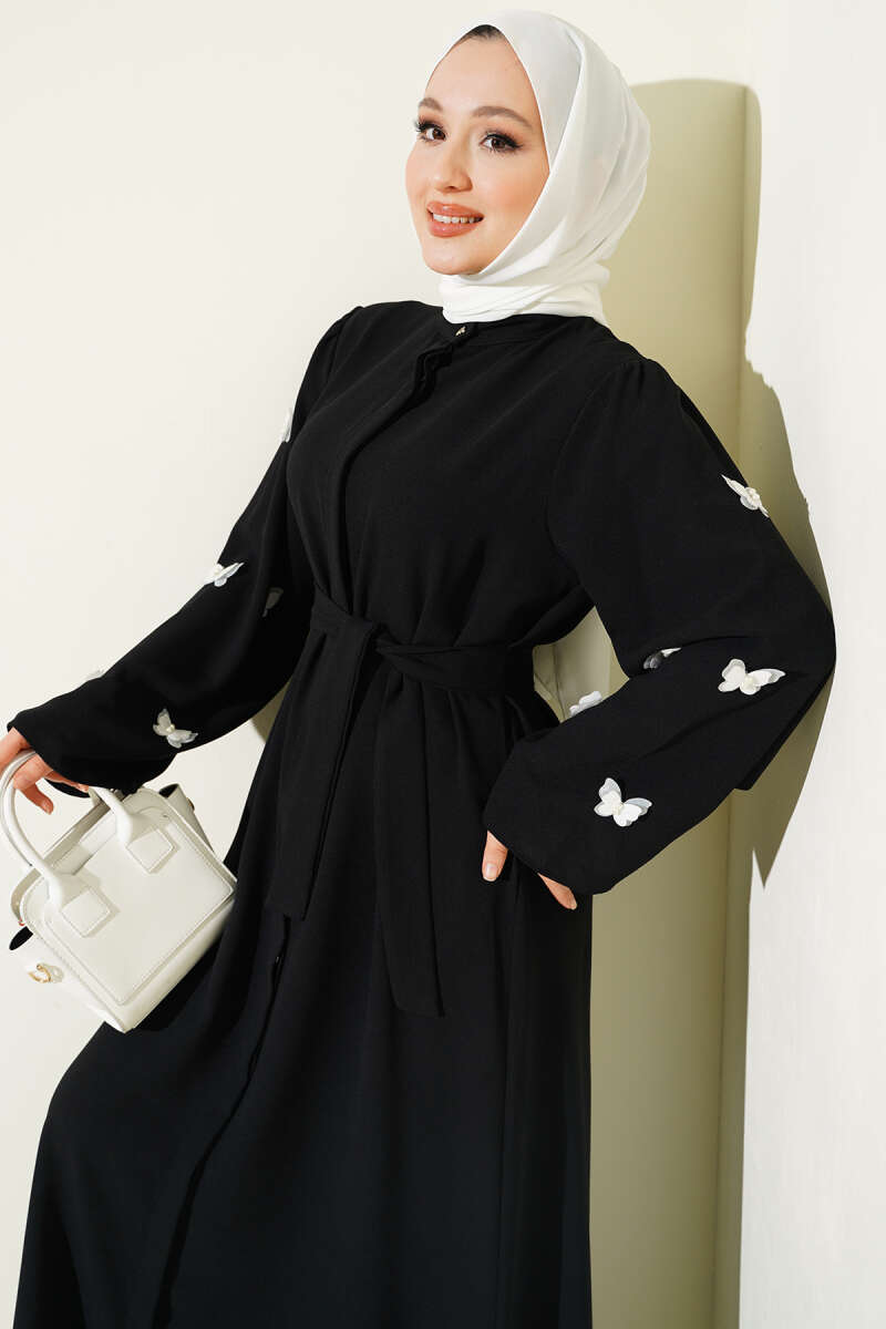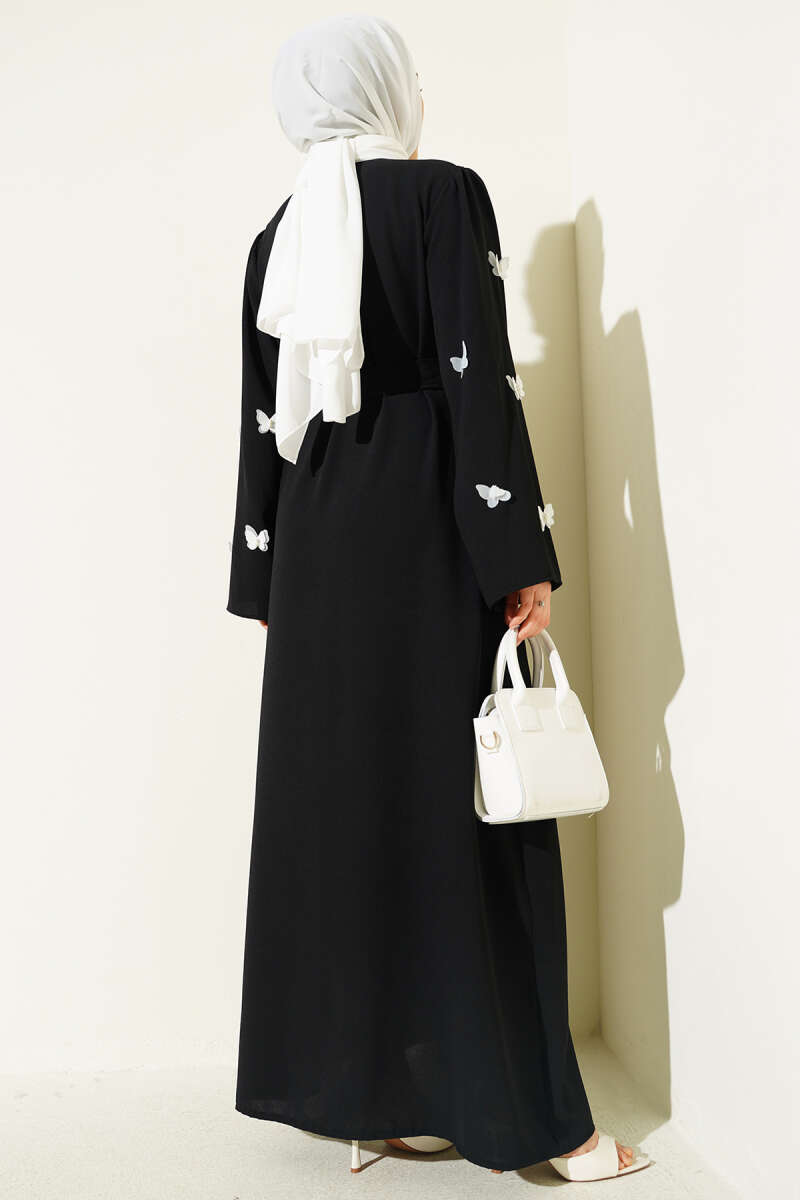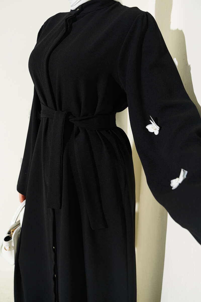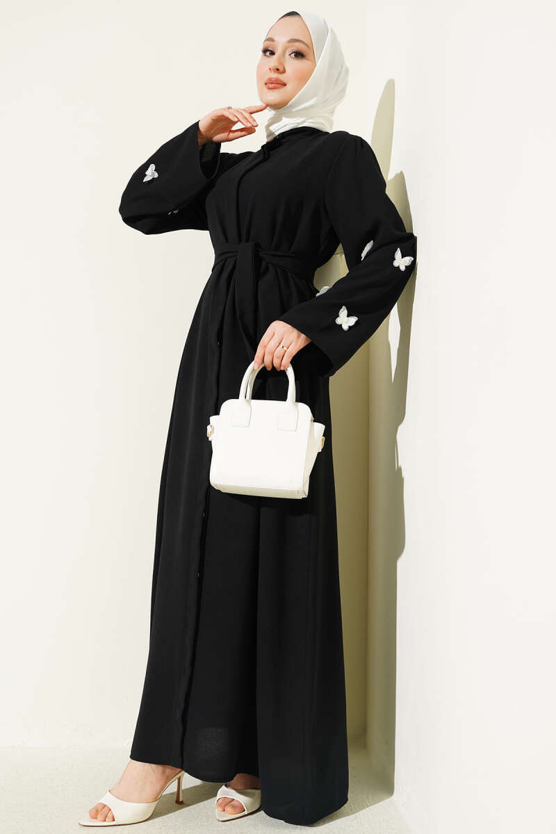 Kelebekli İncili Kuşaklı Ferace Siyah