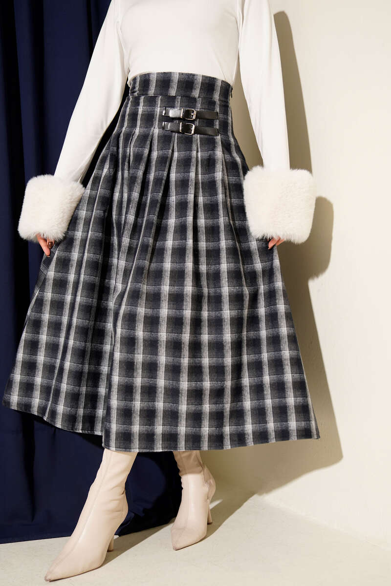 Kemer Aksesuarlı Ekoseli Etek Füme