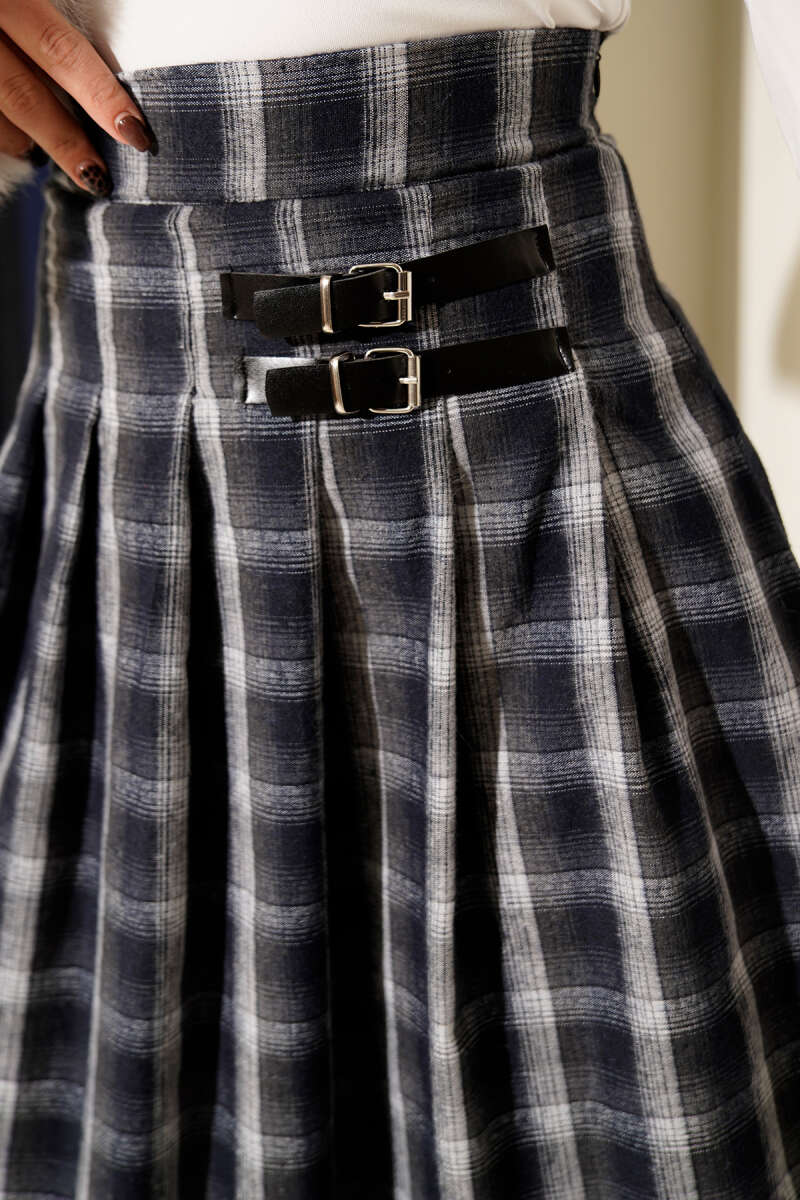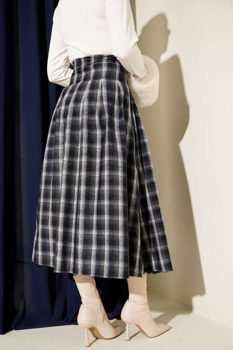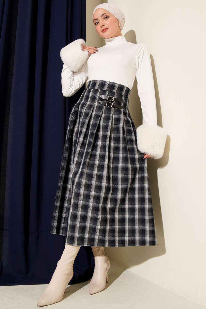 Kemer Aksesuarlı Ekoseli Etek Lacivert