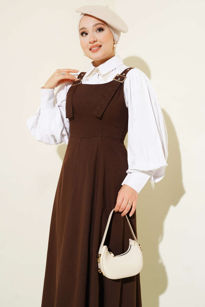 Yaka İnci Detaylı Kuşaklı Abiye Elbise Kahve