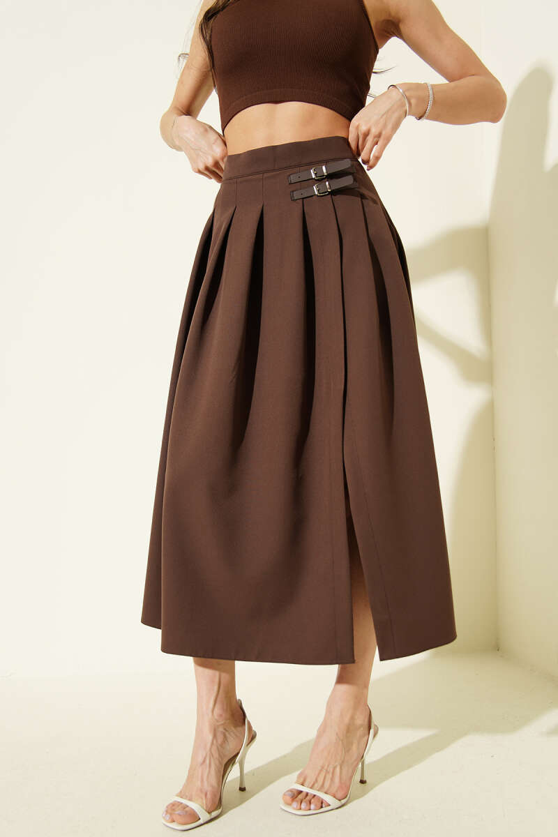 Kemer Detaylı Yırtmaçlı Midi Etek Kahve