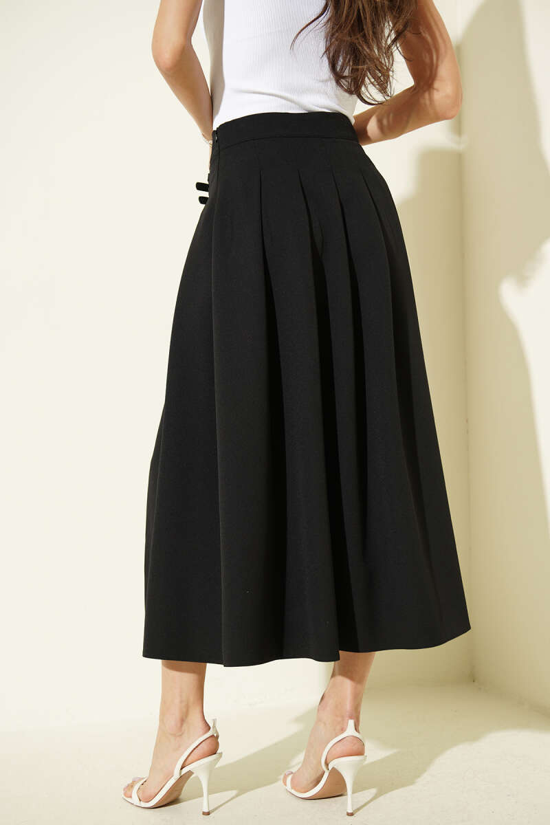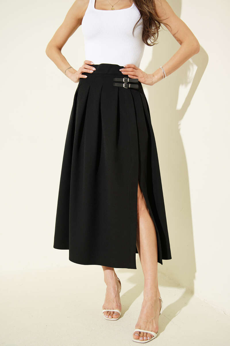 Kemer Detaylı Yırtmaçlı Midi Etek Siyah