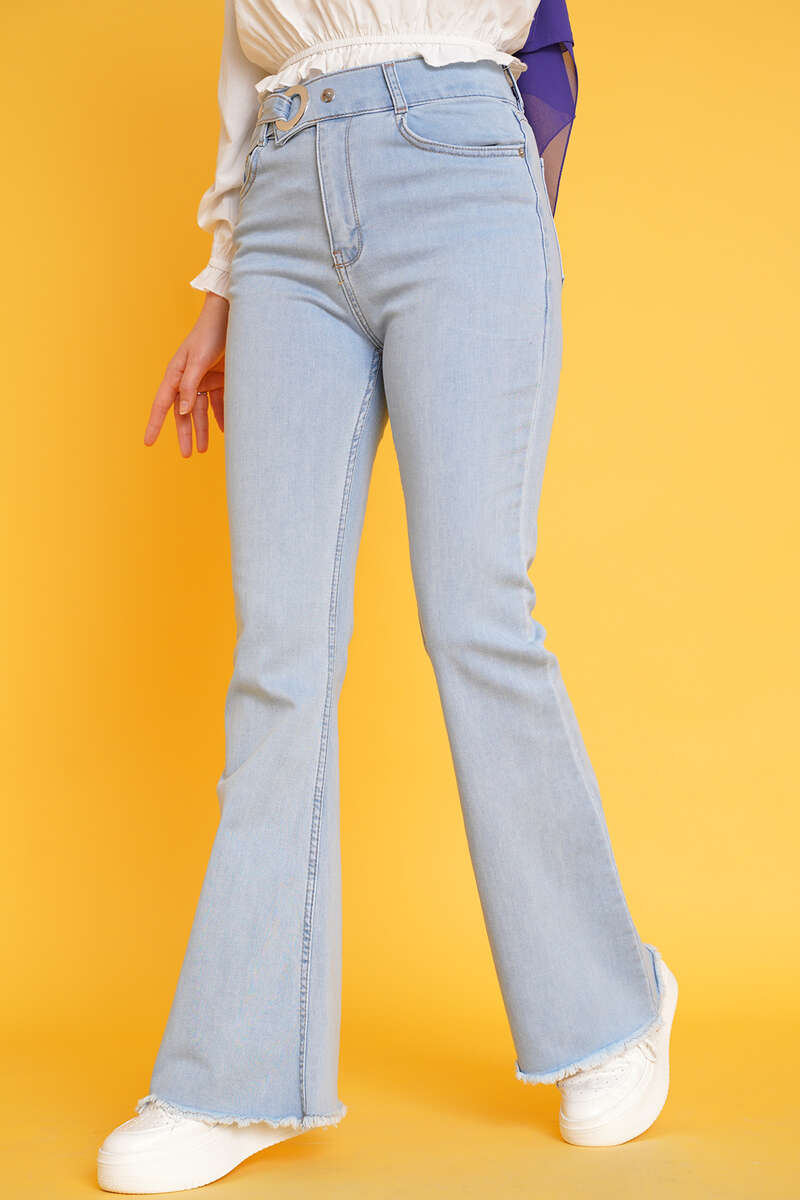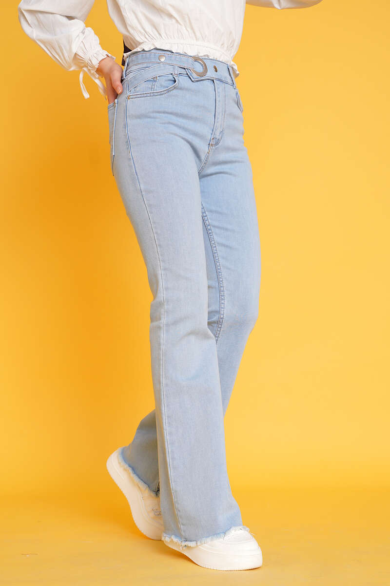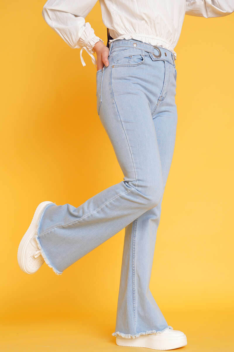 Yeni sezon ispanyol paça jean pantolonumuz şık ve yenilikçi kemer tasarımıyla sizinle. Kemer tokasından geçirilen kemeri çıtçıt düğmeleriyle tutturulabilmektedir. Paçaları sökük püskül model olan pantolonumuz fermuarlı ve çıtçıt düğmelidir.
