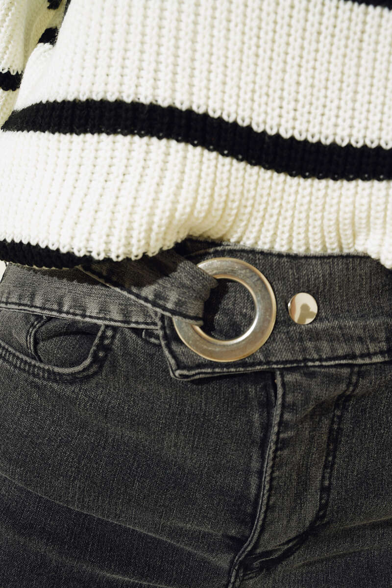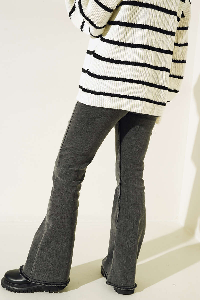 Yeni sezon ispanyol paça jean pantolonumuz şık ve yenilikçi kemer tasarımıyla sizinle. Kemer tokasından geçirilen kemeri çıtçıt düğmeleriyle tutturulabilmektedir. Paçaları sökük püskül model olan pantolonumuz fermuarlı ve çıtçıt düğmelidir.