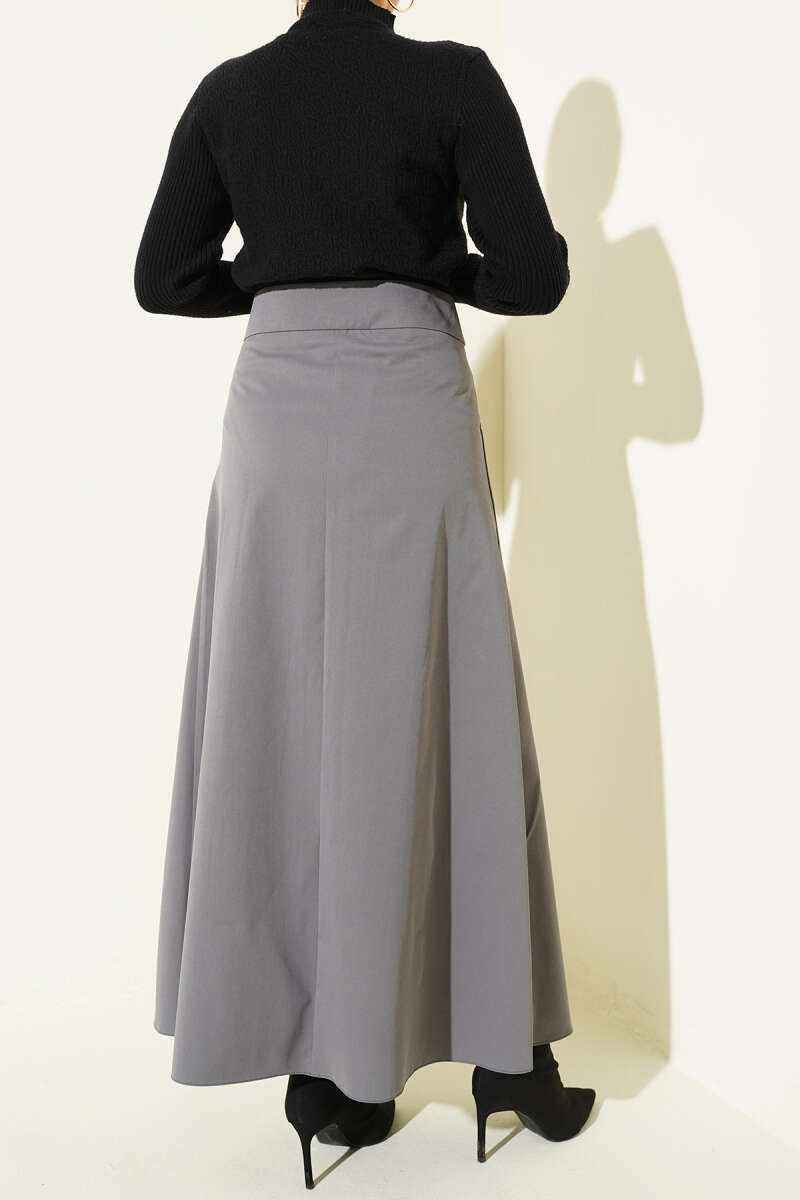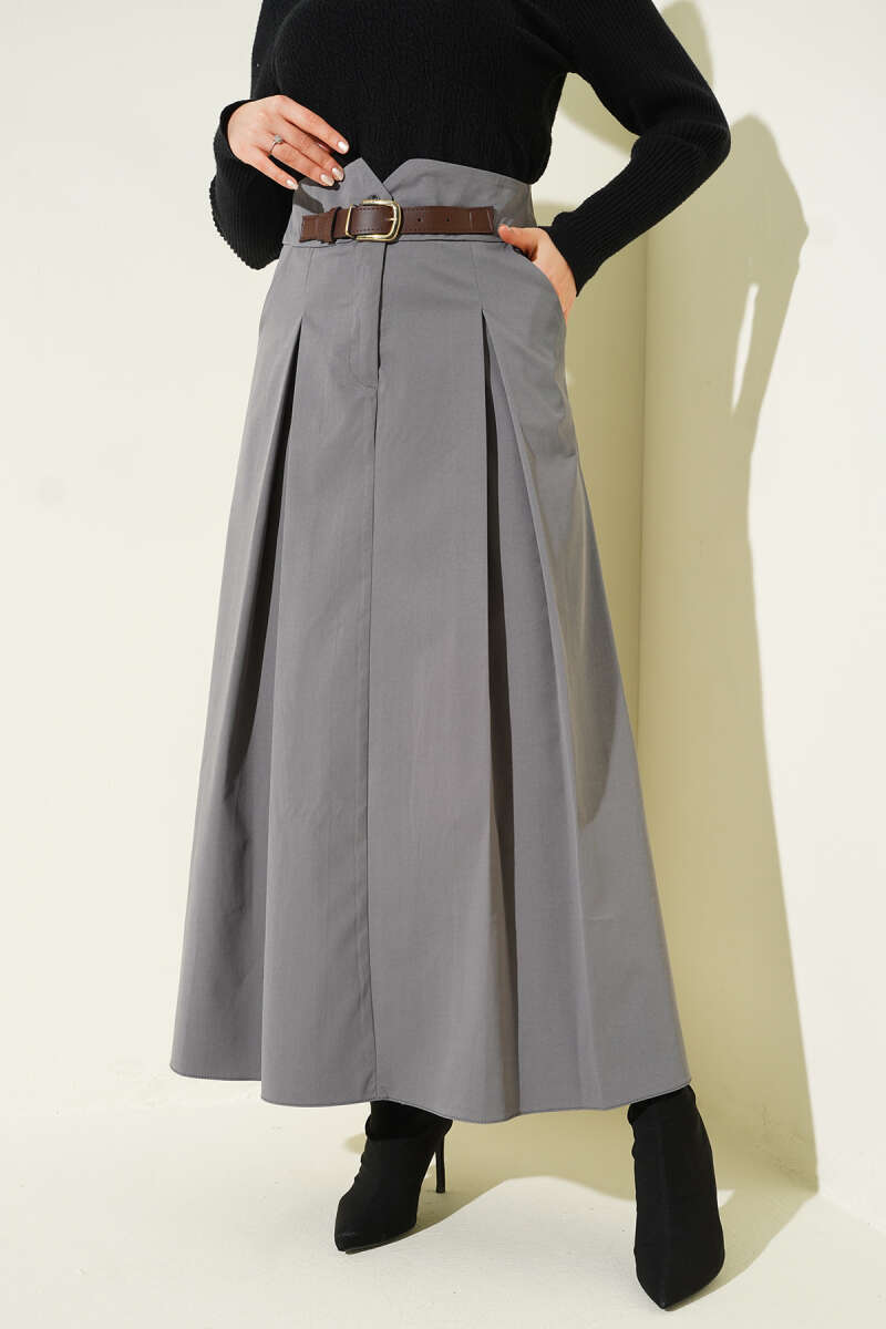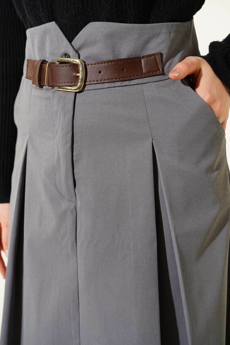 Kemerli Pile Detaylı Cepli Etek Füme
