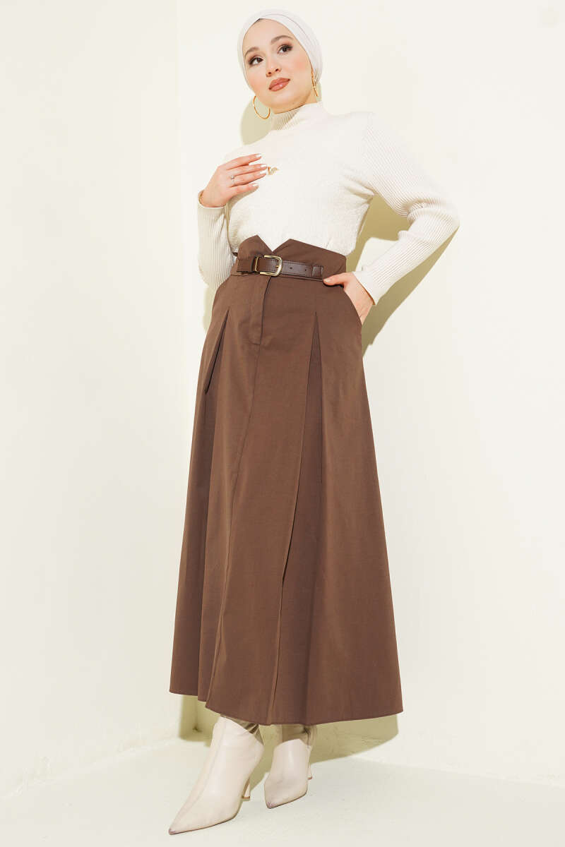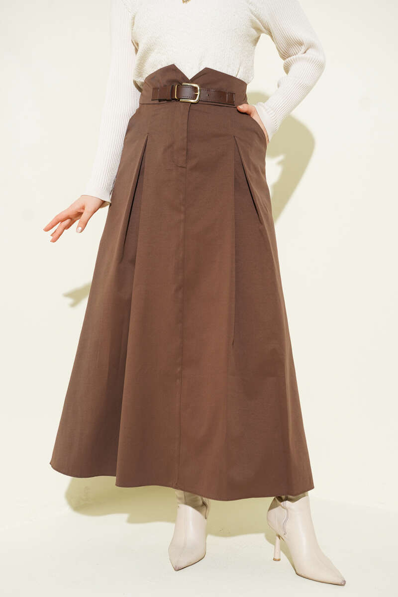 Kemerli Pile Detaylı Cepli Etek Bordo
