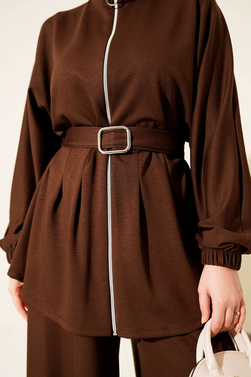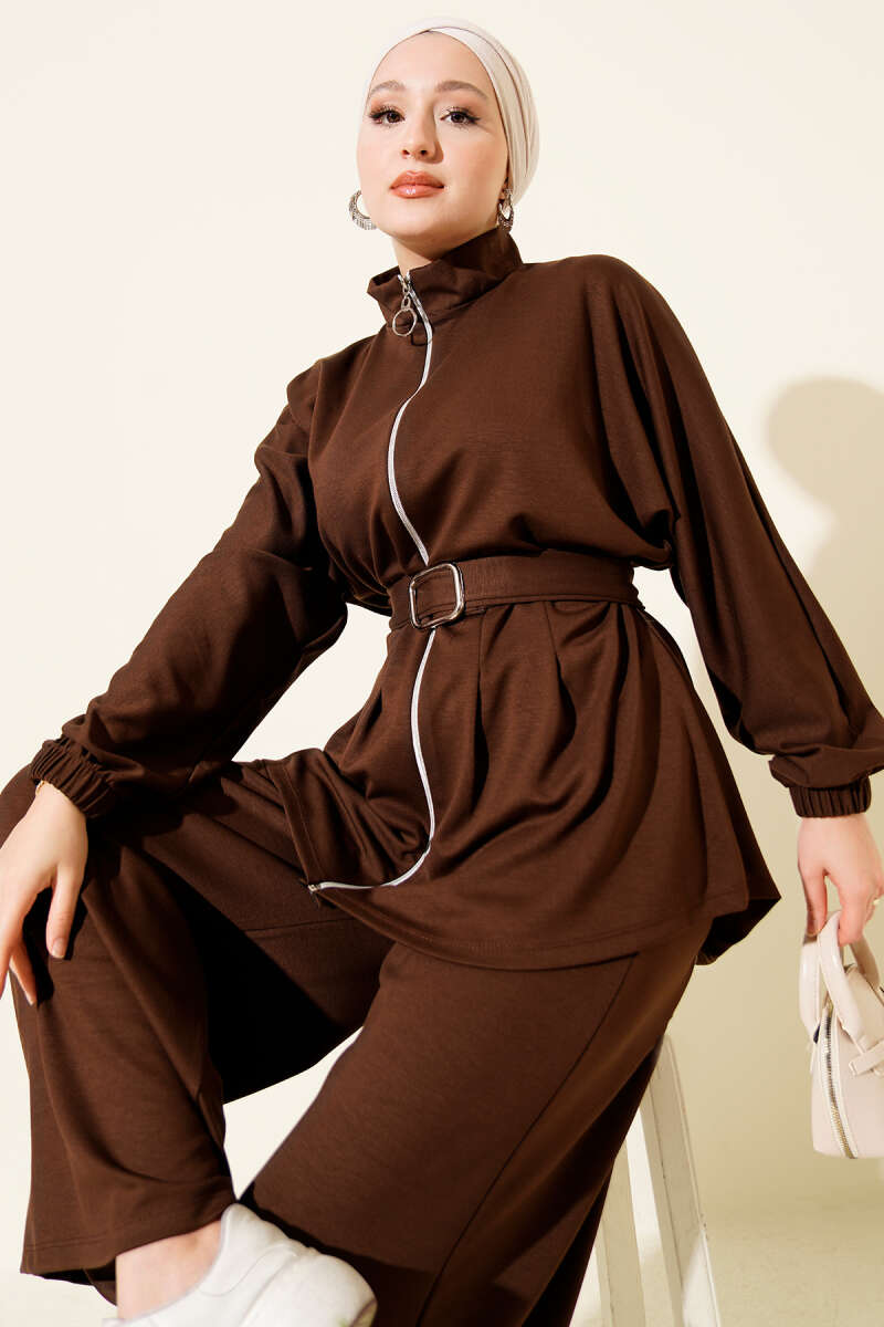 Denizci Yaka Dantelli Tunik İkili Takım Kahve