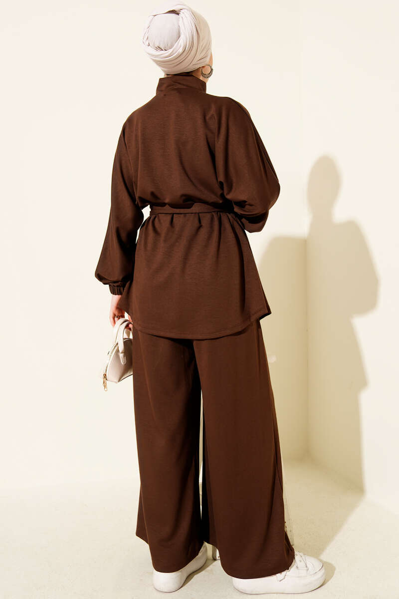 İnci Çiçekli Bel Tünelli Etekli Takım Kahve