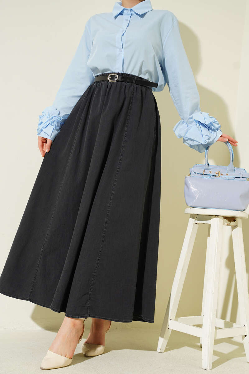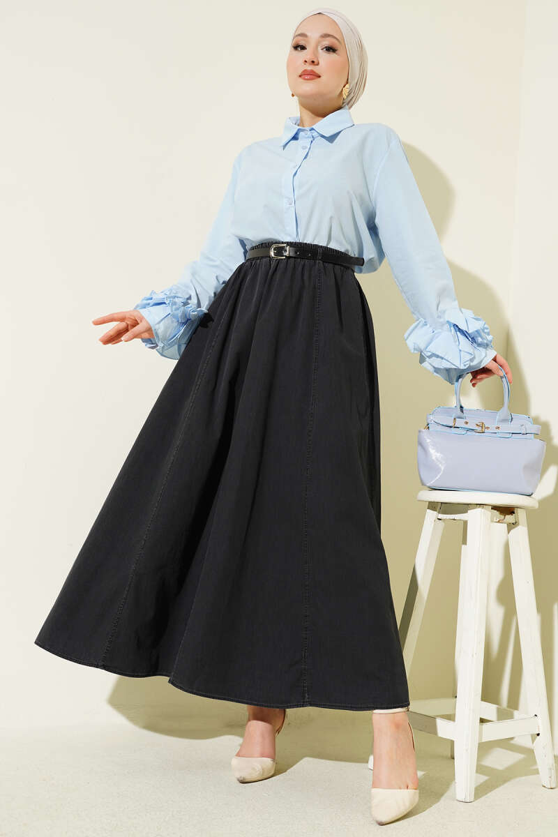 Kemerli Bel Lastikli Kloş Etek Açık Mavi
