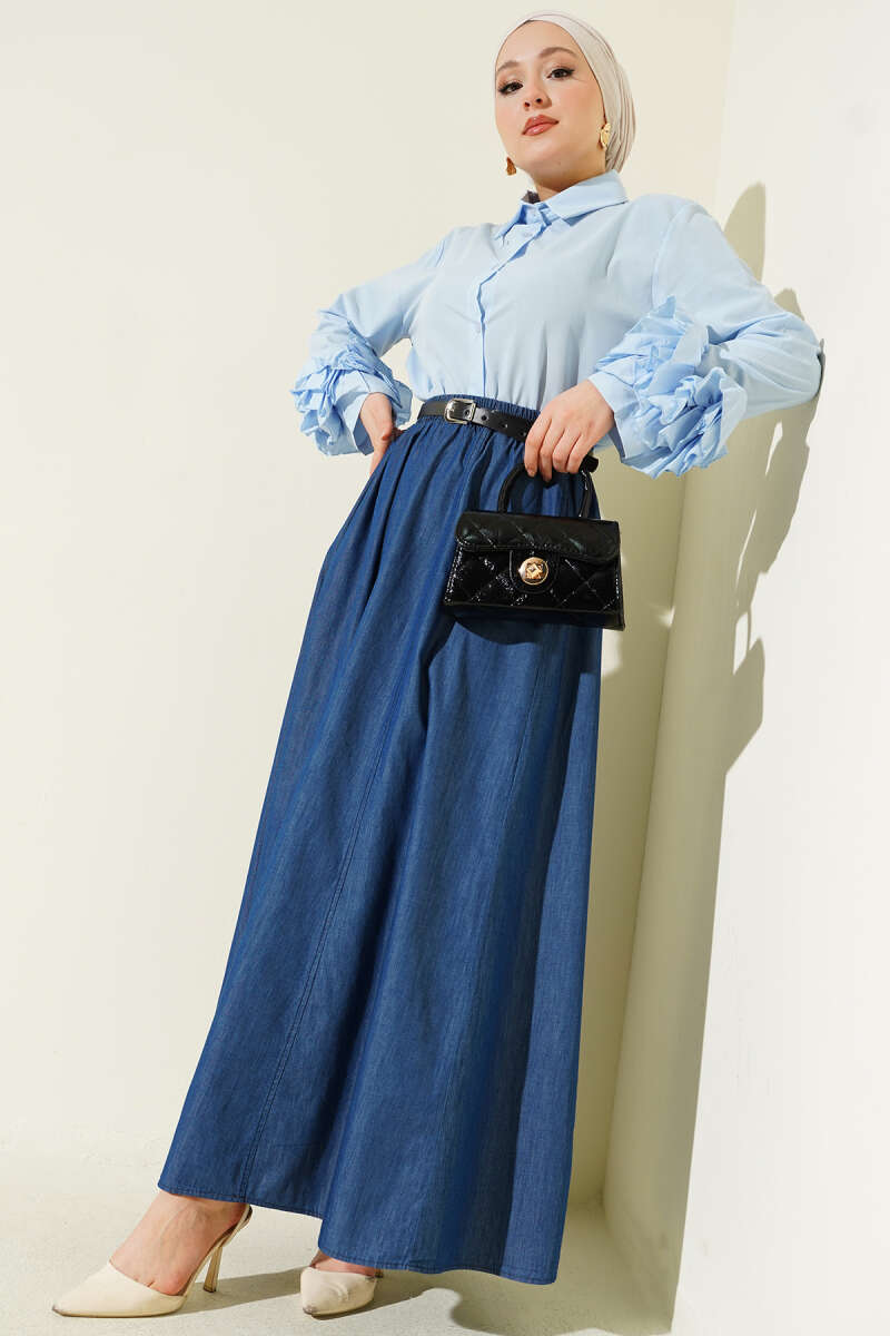 Kemerli Bel Lastikli Kloş Etek Açık Mavi