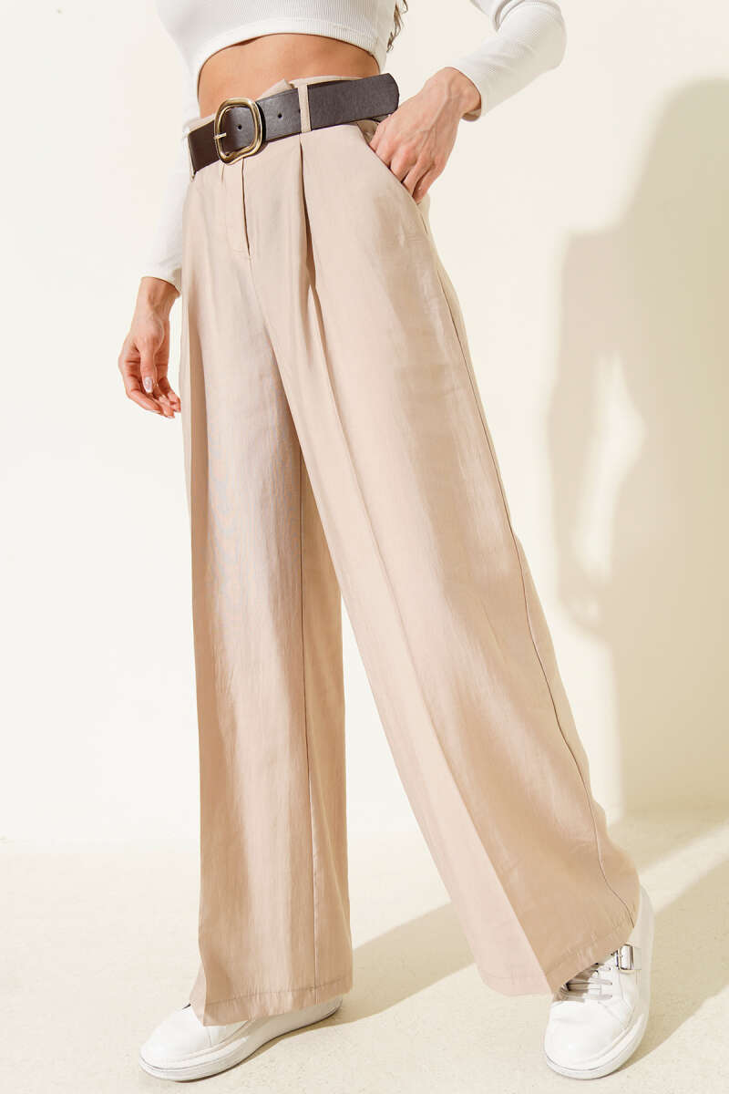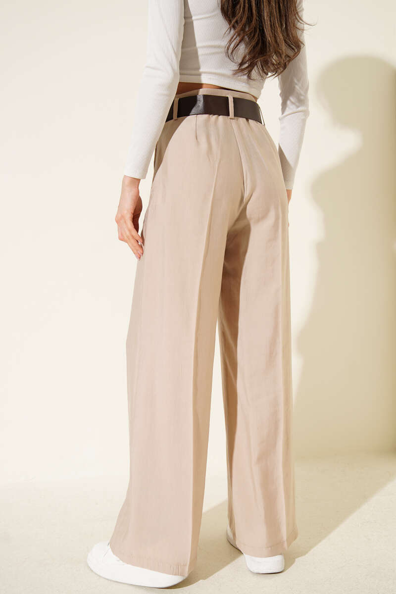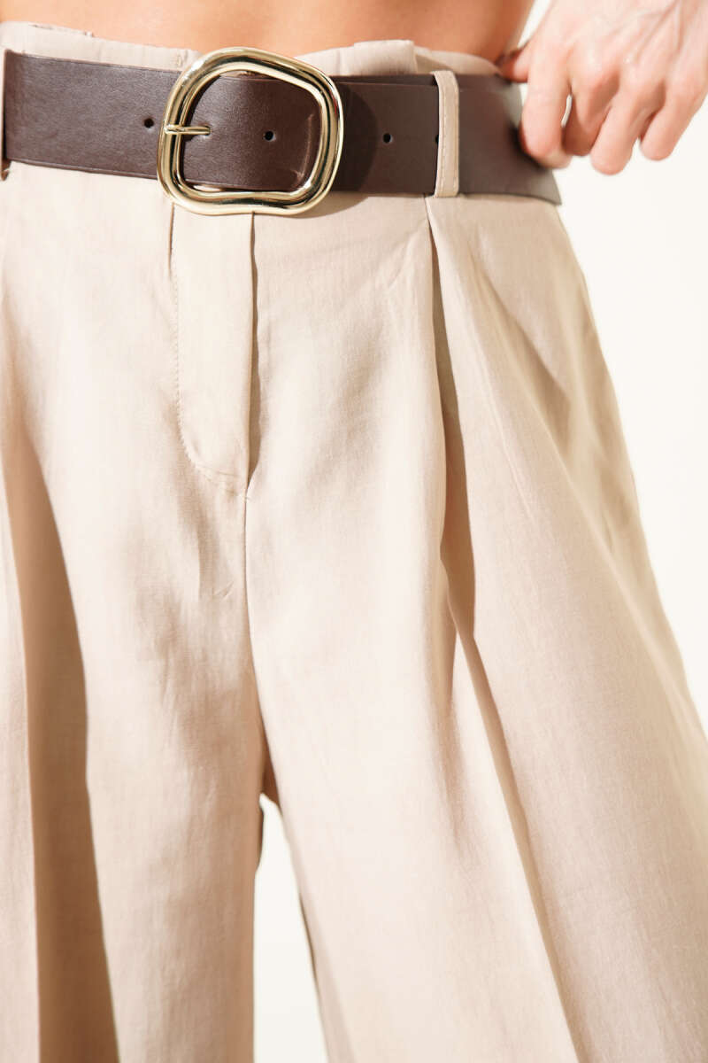 Kemerli Bel Pileli Geniş Paça Pantolon Taş