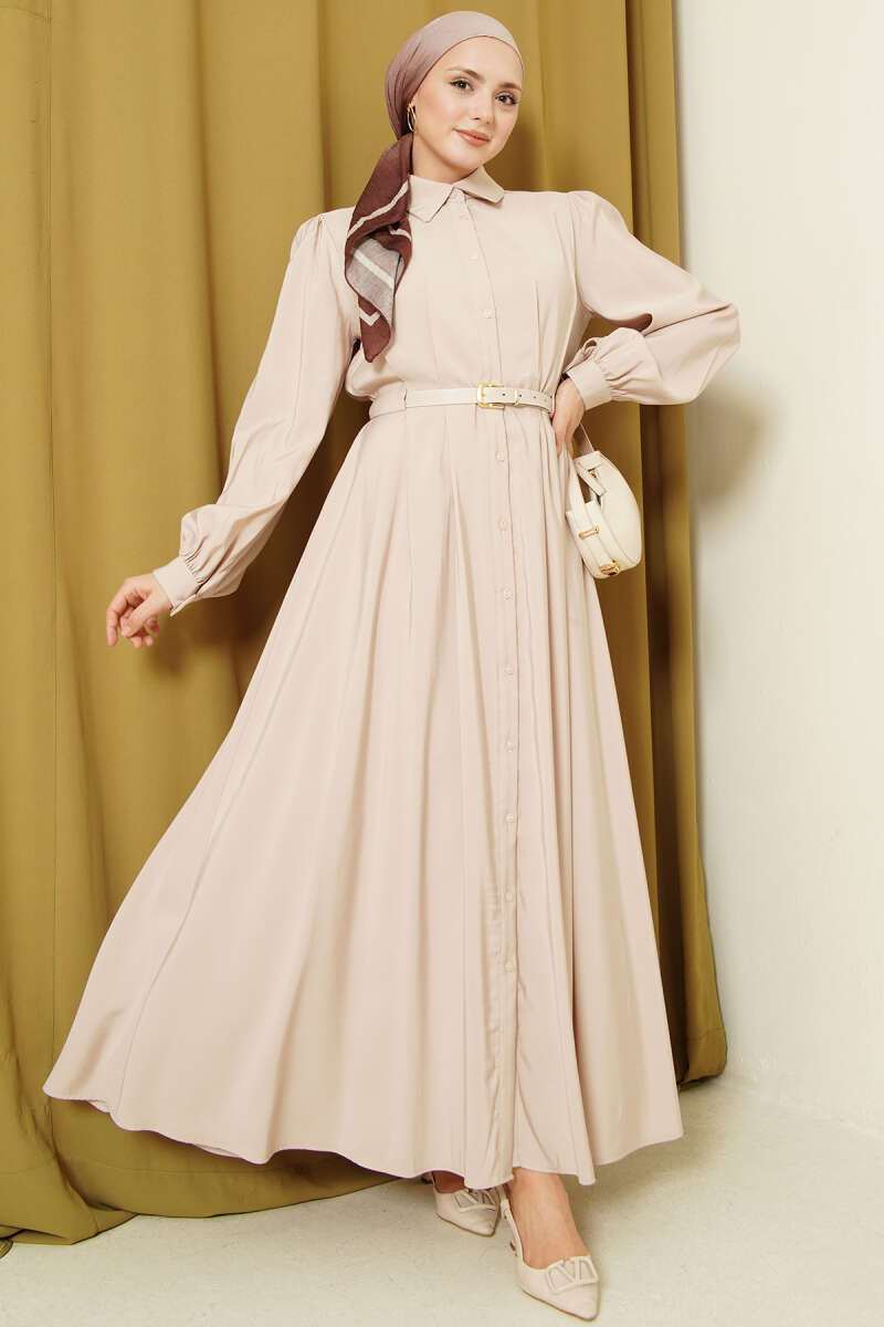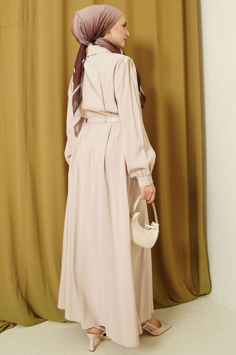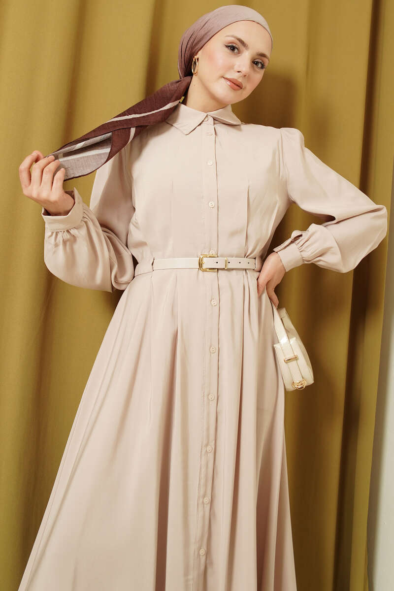 Kemerli Boydan Düğmeli Modal Elbise Bej