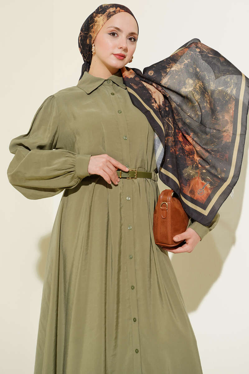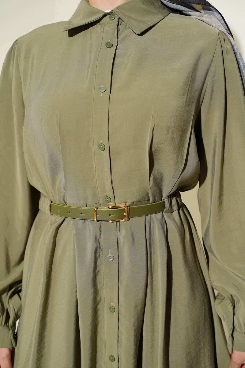 Kemerli Boydan Düğmeli Modal Elbise Haki