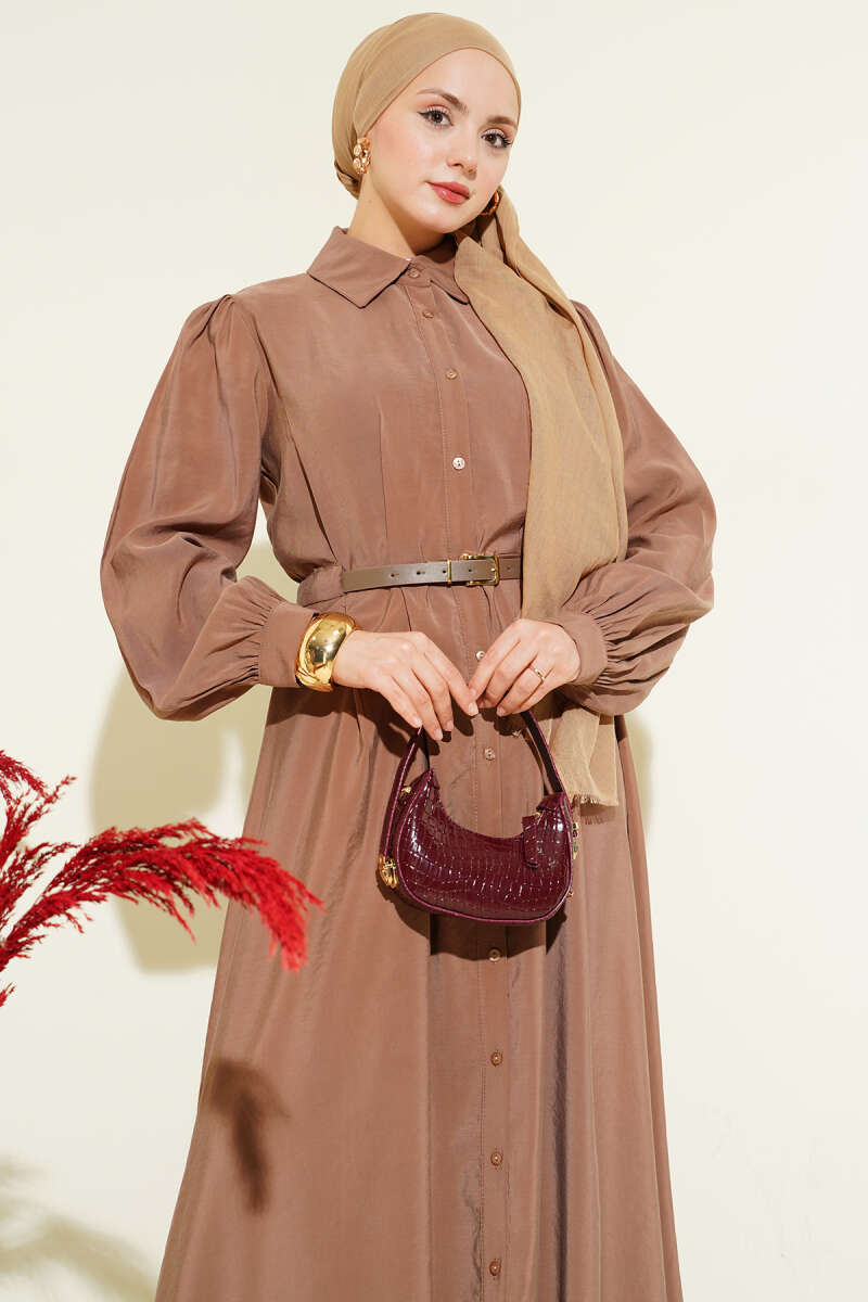Kemerli Boydan Düğmeli Modal Elbise Kahve