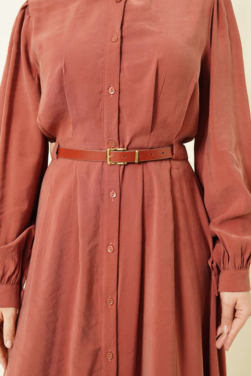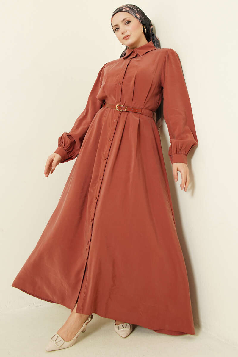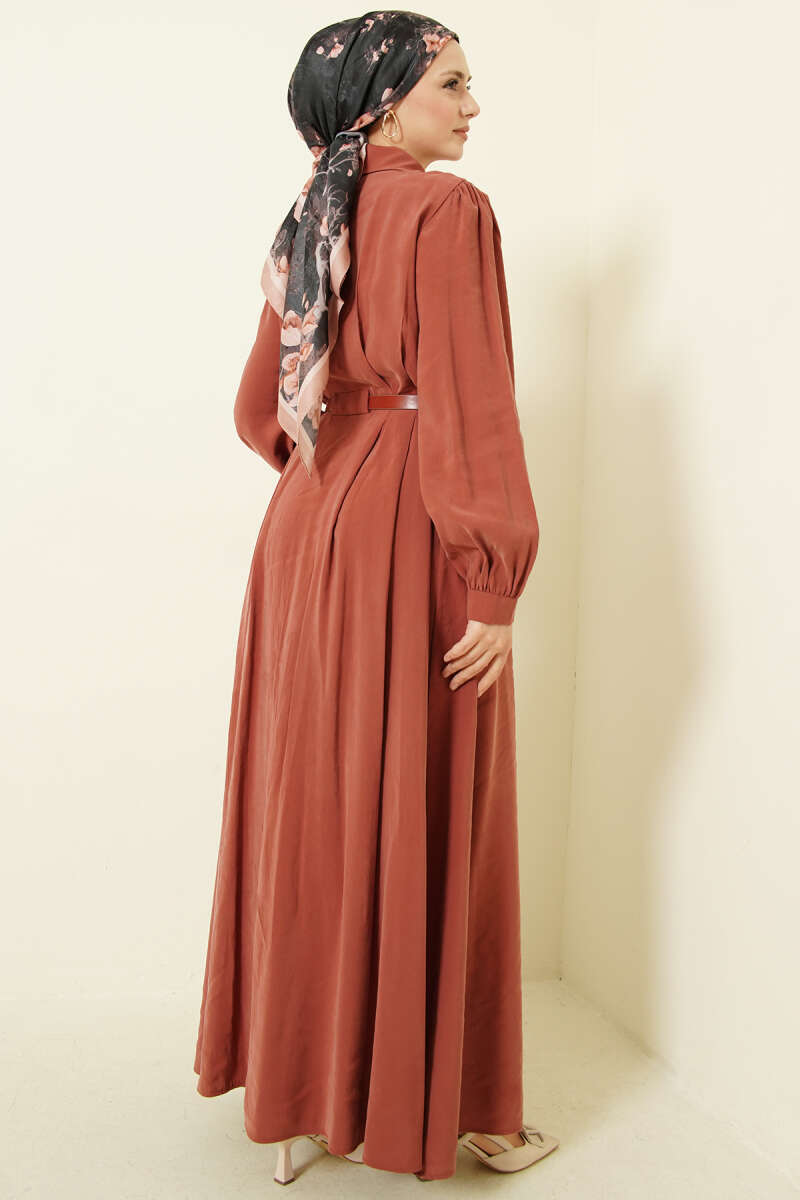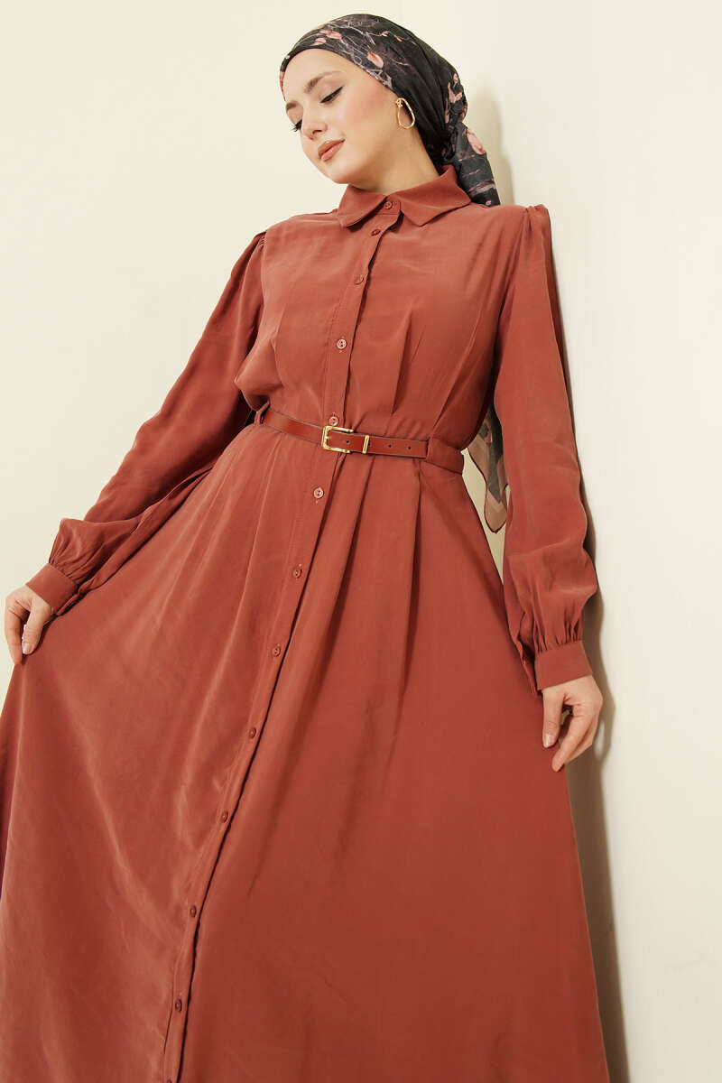 Kemerli Boydan Düğmeli Modal Elbise Kiremit