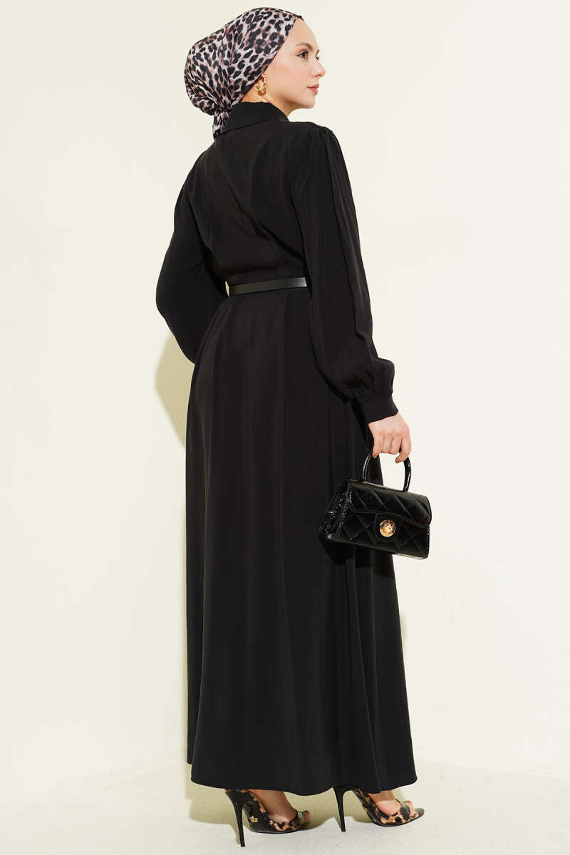 Düğmeli Kemerli Jile Elbise Siyah