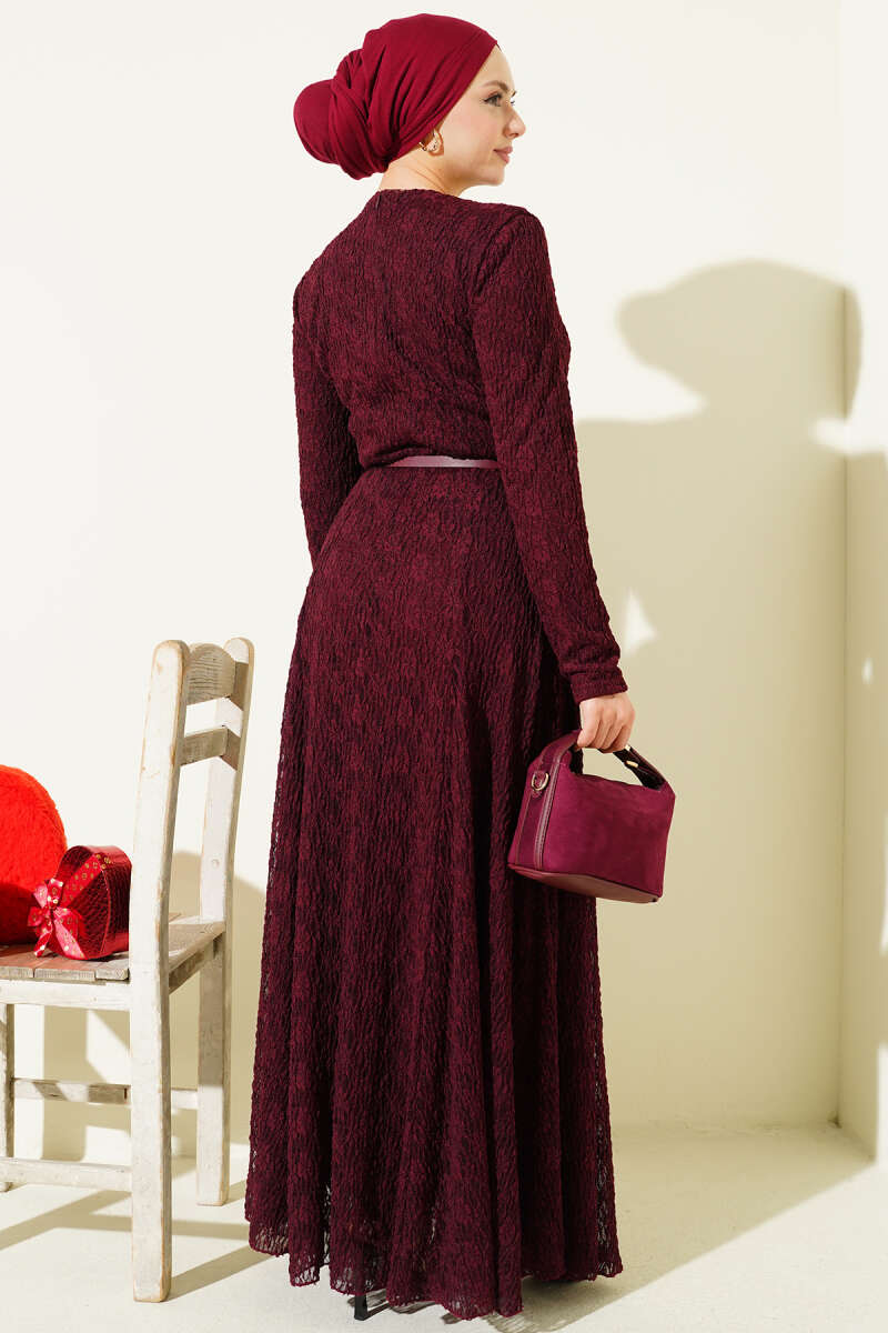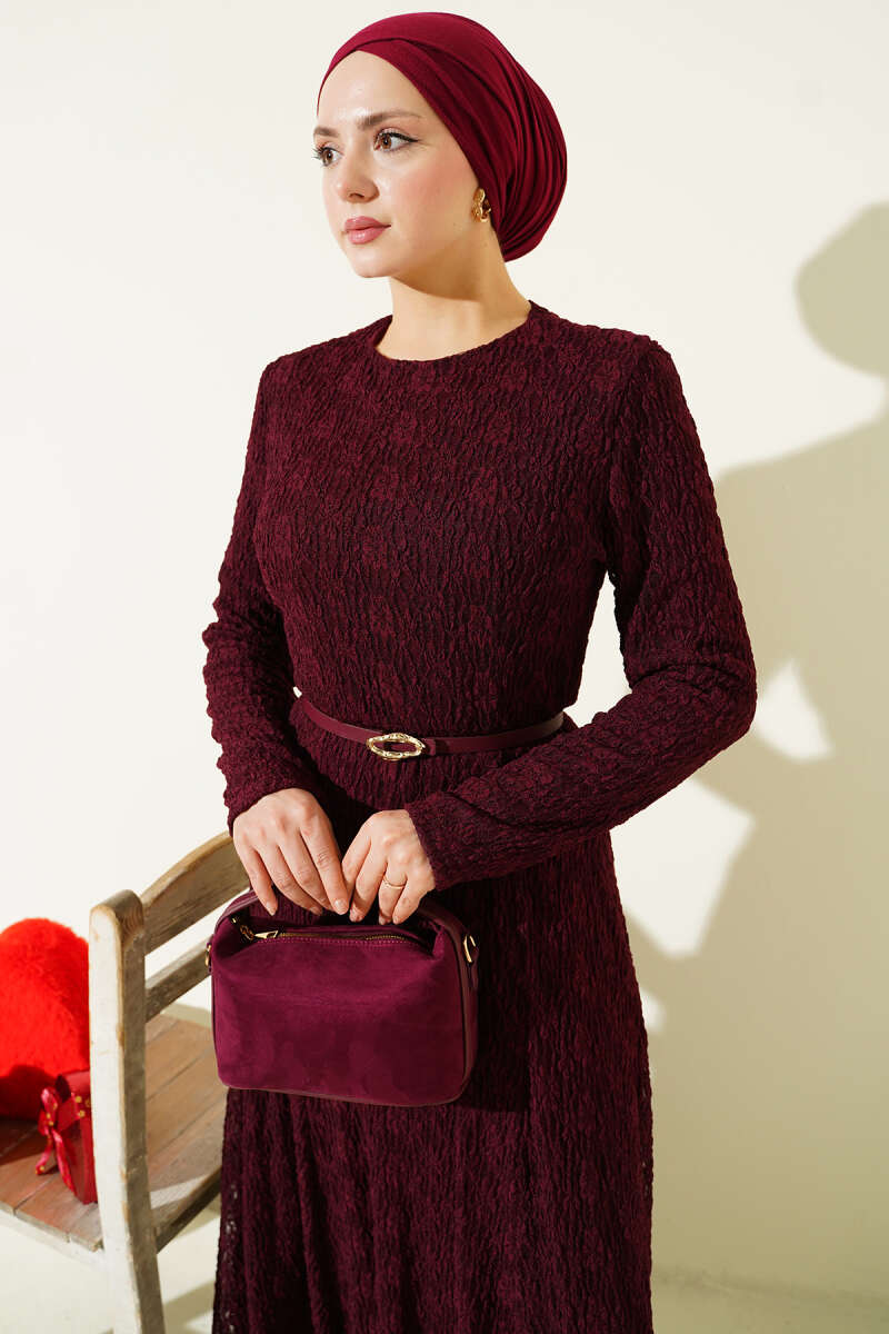 Boydan Düğmeli Kemerli Tensel Elbise Vizon