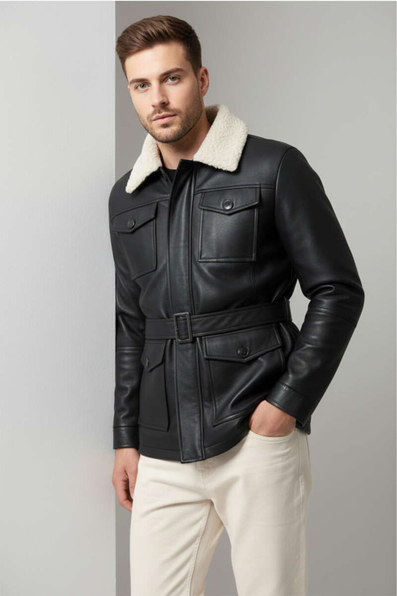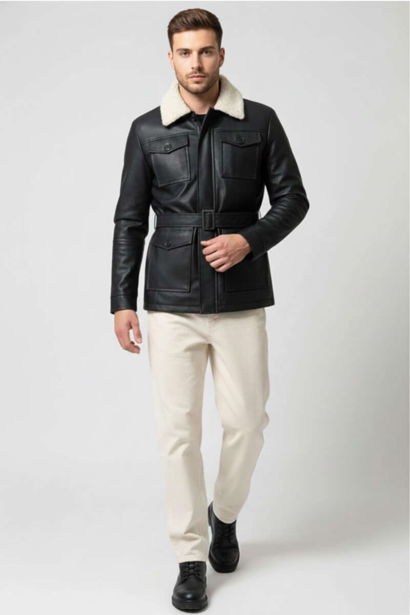 Fermuarlı Cepli Yaka Kürklü Erkek Deri Mont Kahve