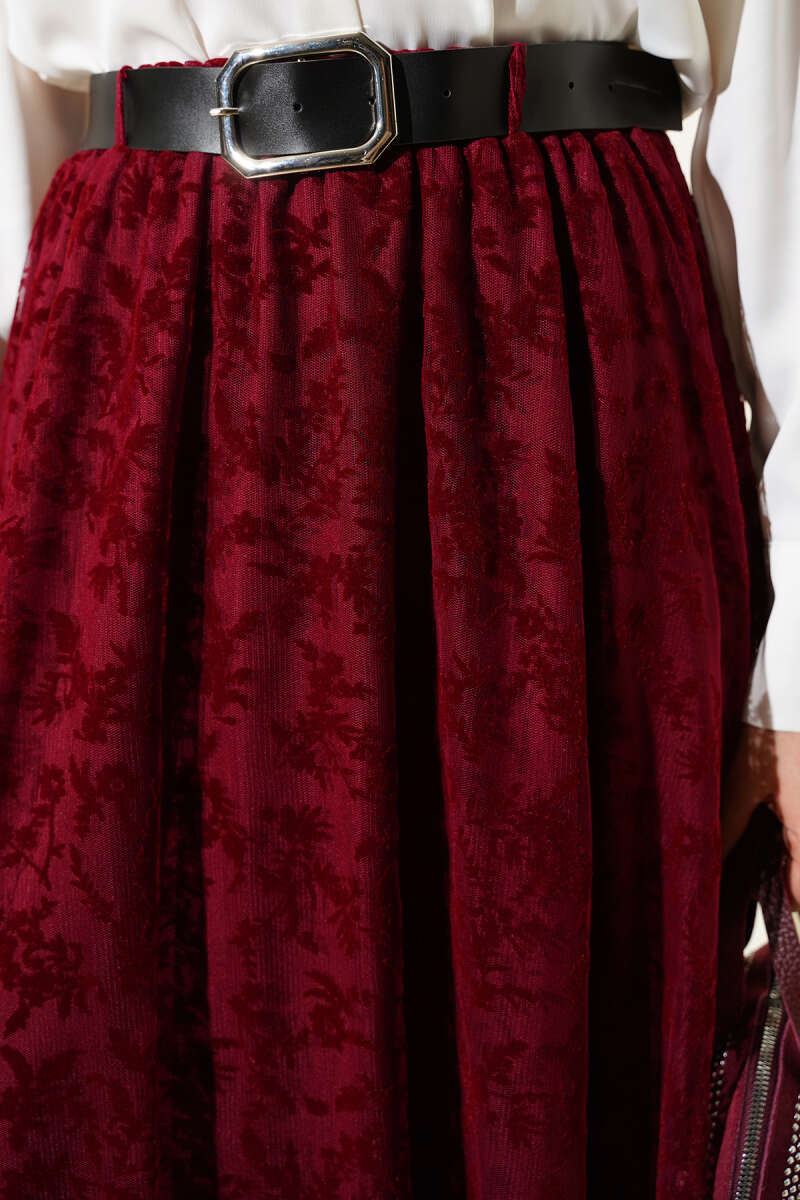 Kemerli Çiçek Tüllü Kloş Etek Bordo