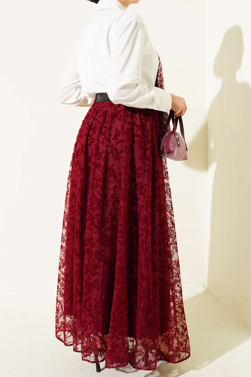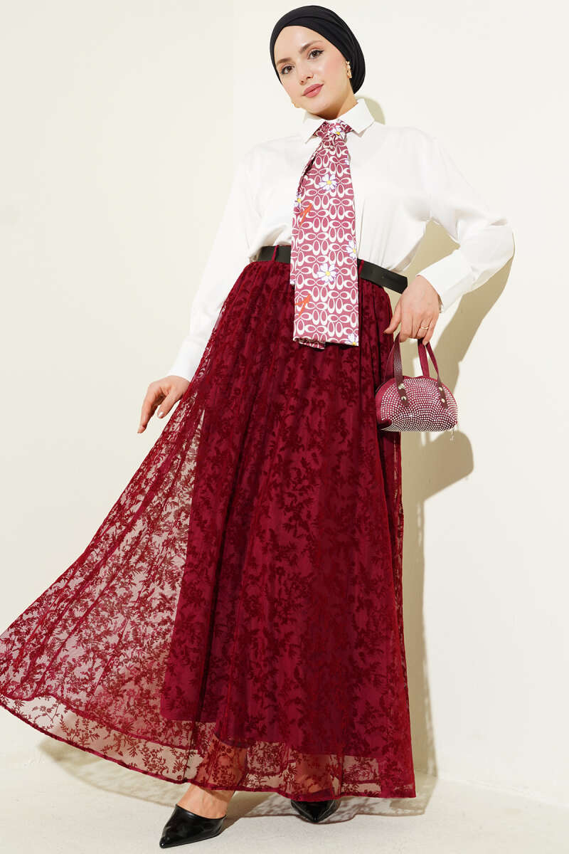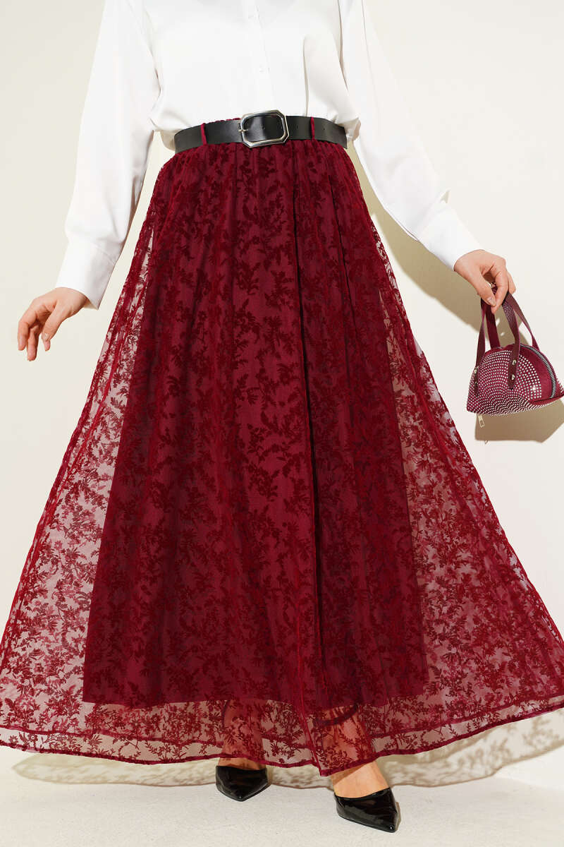 Kemerli Çiçek Tüllü Kloş Etek Bordo