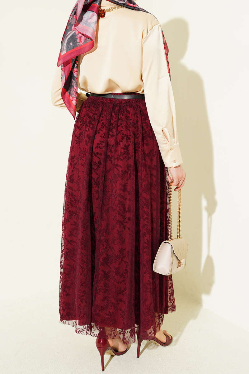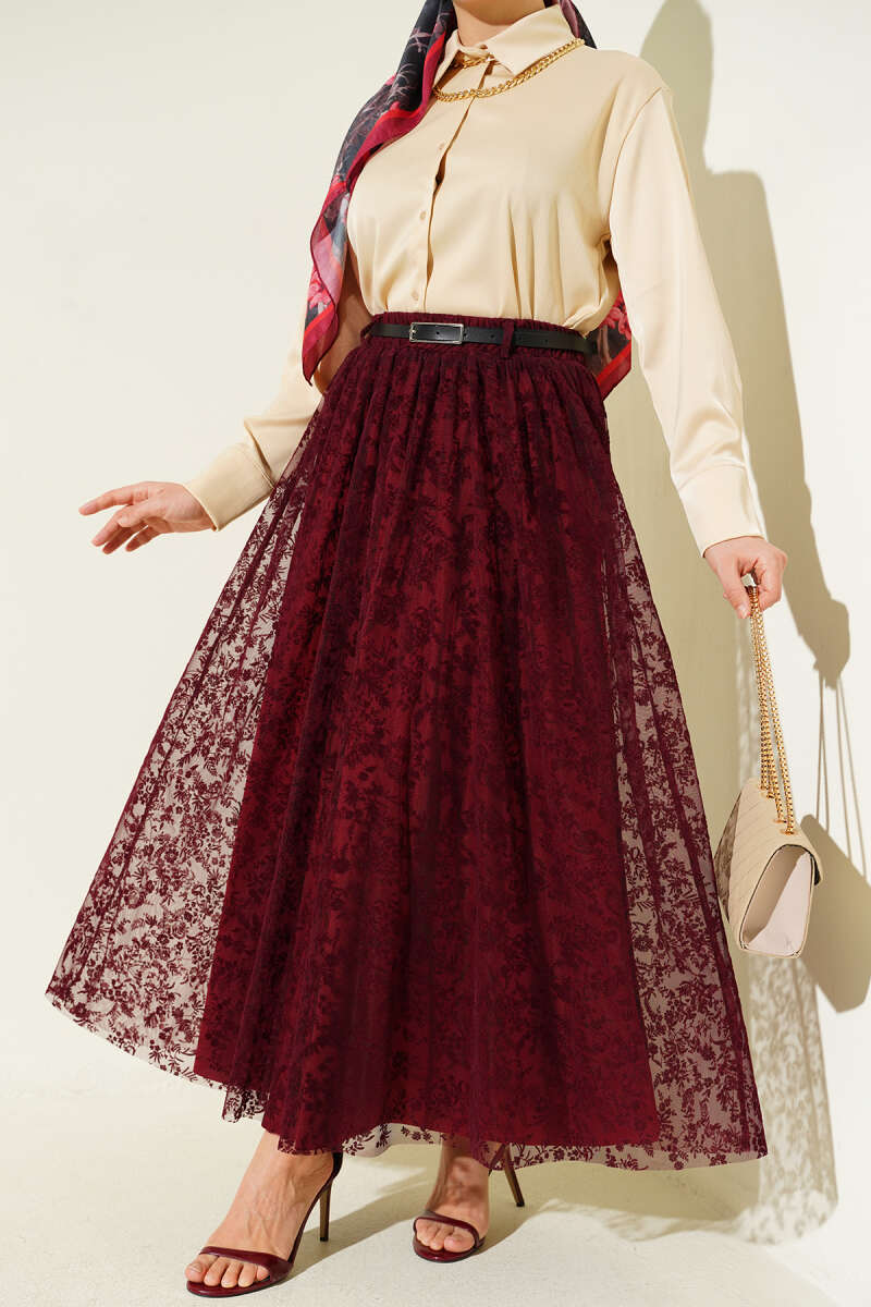 Kemerli Çiçekli Kloş Tül Etek Bordo