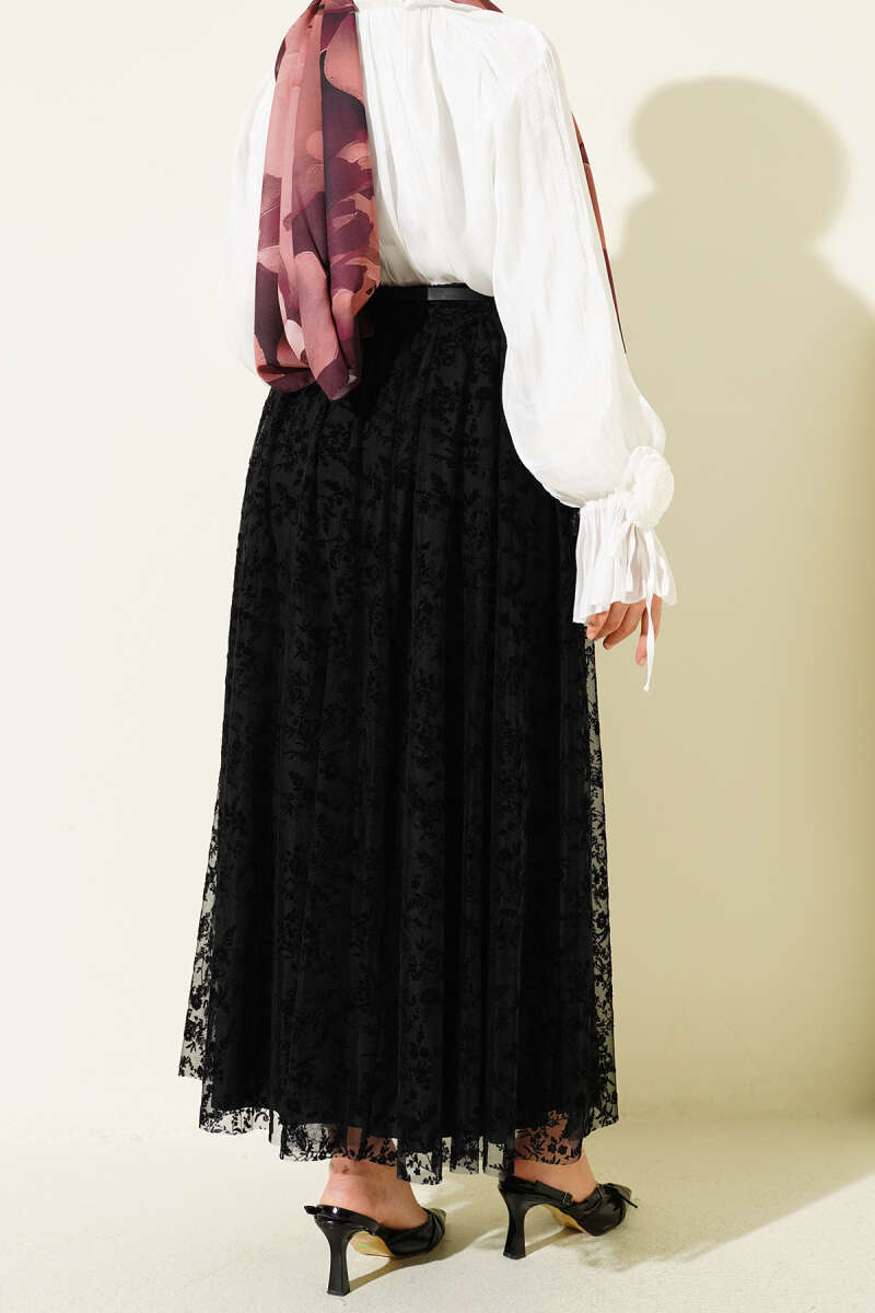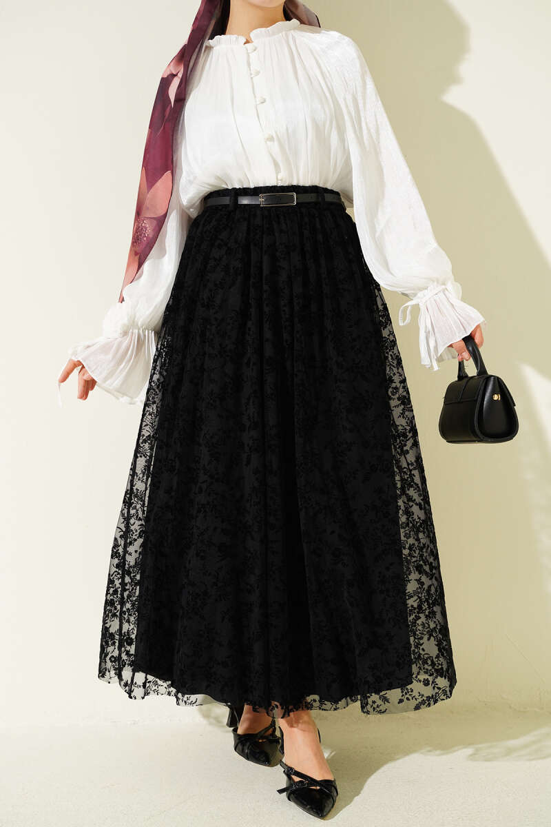 Kemerli Çiçekli Kloş Tül Etek Siyah