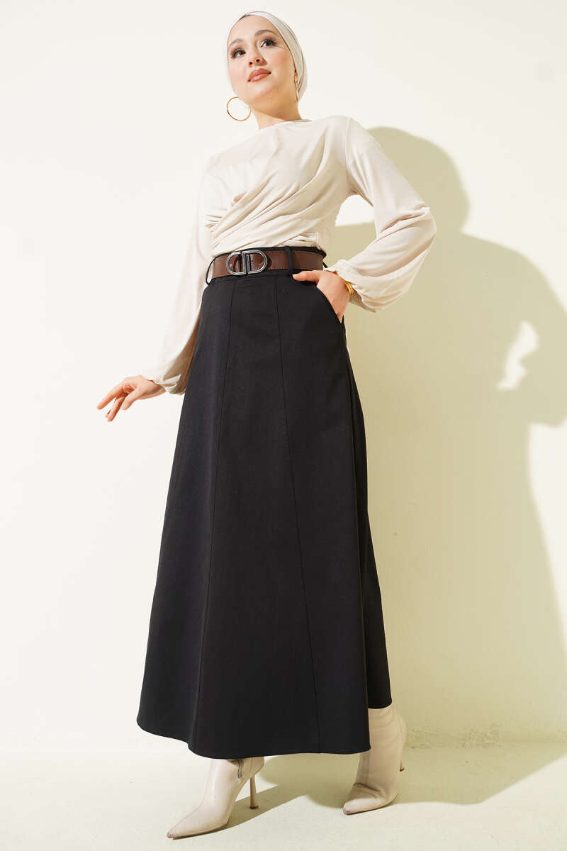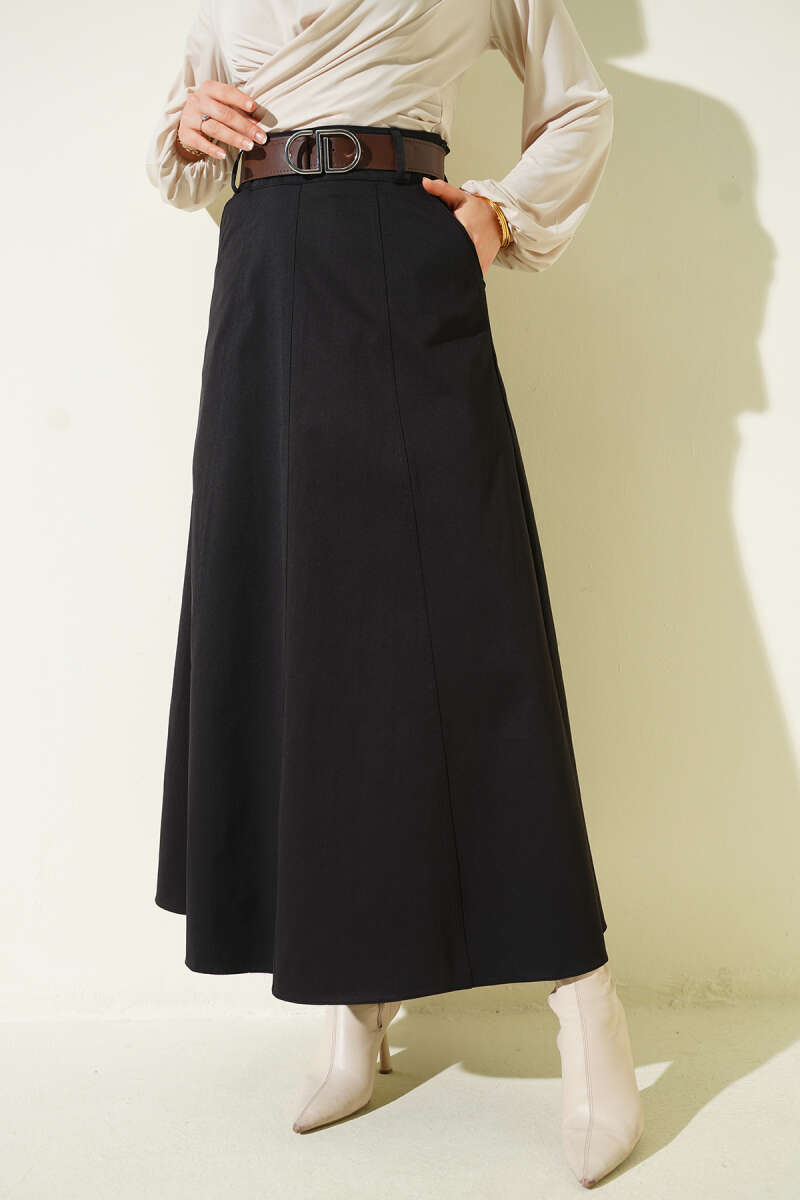 Düğme Detaylı Kemerli Deri Etek Siyah