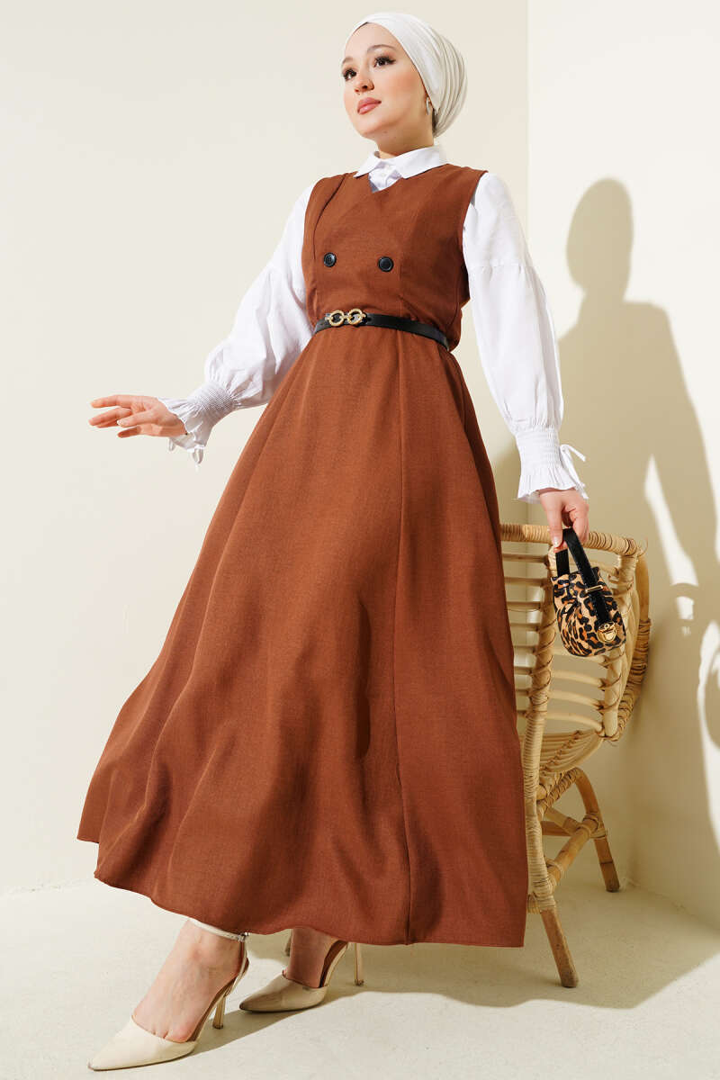 Kemerli Çift Düğmeli Jile Elbise Bej