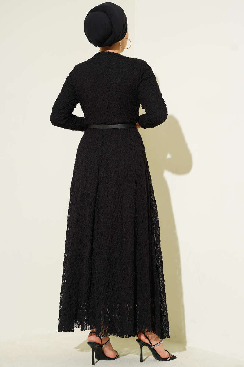 Kemerli Dantelli Kloş Elbise Siyah